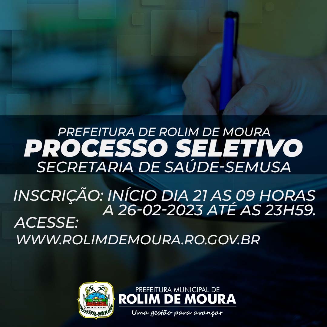 O Processo de seleção será realizado por meio de análise de Currículo, títulos e será de responsabilidade da Comissão designada pelo Decreto nº 056/2023. As inscrições serão feitas exclusivamente online no site da prefeitura de Rolim de Moura no período do 21 de fevereiro a 26 de fevereiro de 2023.