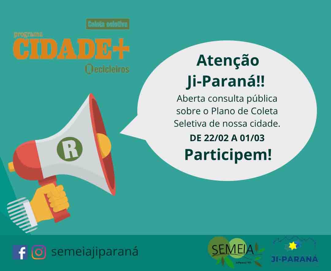 A Prefeitura Municipal de Ji-Paraná, por meio da Secretaria Municipal de Meio Ambiente, está convidando toda população para participar de uma consulta pública virtual, para discussão do Plano Municipal de coleta seletiva de resíduos.