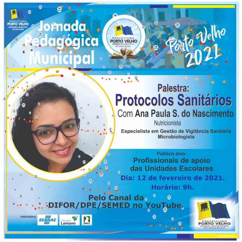 A Prefeitura de Porto Velho promoveu, na sexta-feira (12), a palestra “Protocolos Sanitários”, com a participação da nutricionista Ana Paula S. do Nascimento, que abordou os protocolos de segurança que devem ser observados no retorno das atividades presenciais na rede municipal de ensino. A atividade, organizada pela Secretaria Municipal de Educação (Semed), através do Departamento de Saúde Escolar, foi transmitida pela internet no canal da DIFOR/DPE/SEMED, no YouTube.