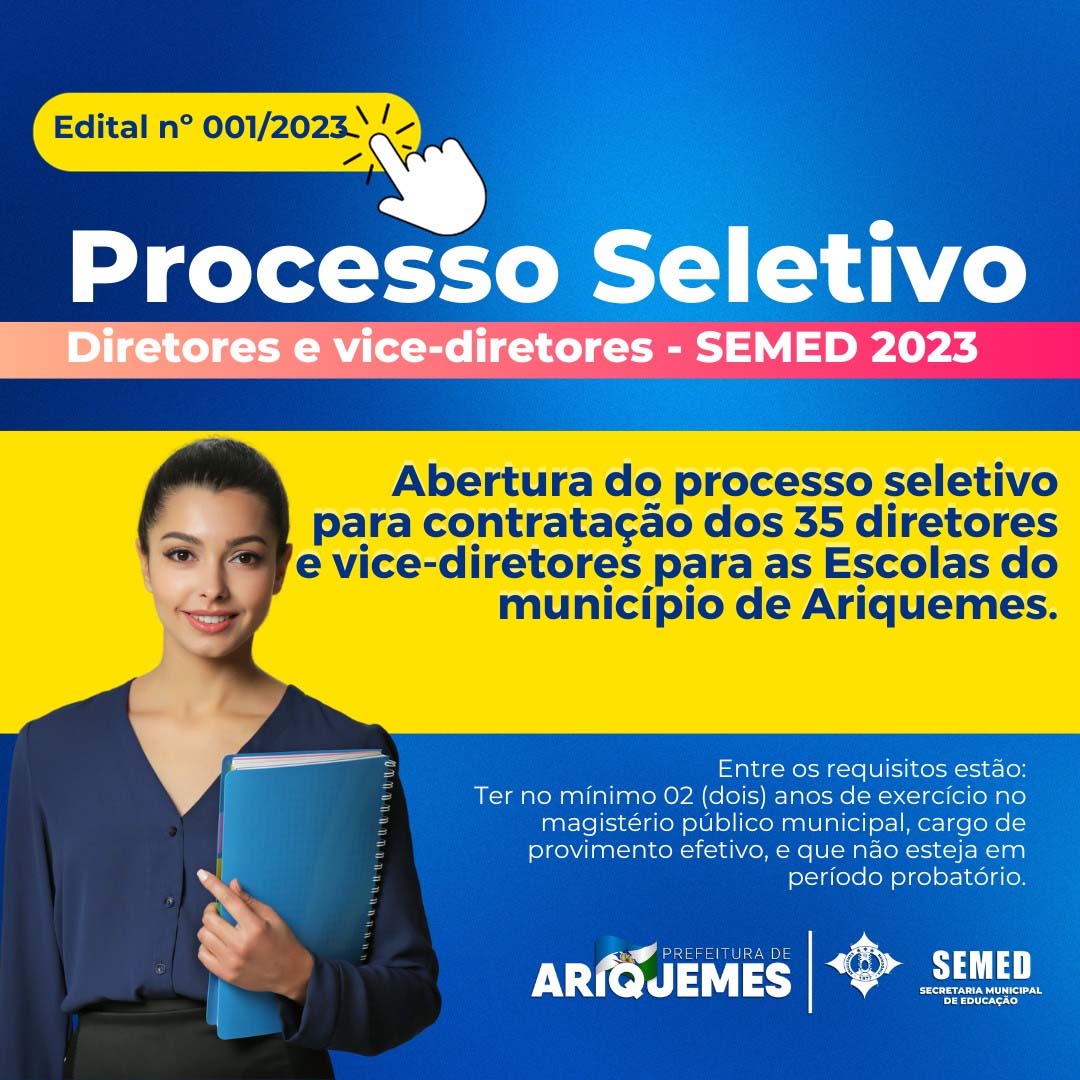 A Prefeitura de Ariquemes, através da Secretaria Municipal de Educação - SEMED, divulgou nesta sexta-feira (20), o edital de abertura do processo seletivo para escolha de diretores e vice-diretores para as escolas municipais de Ariquemes.