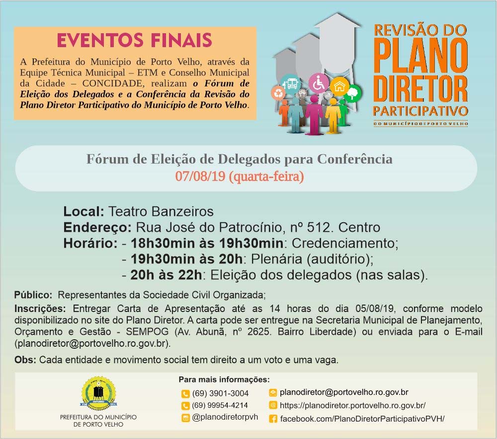 A Prefeitura realiza no próximo dia 7 de agosto, a partir das 18h30min, no Teatro Banzeiros, o Fórum de Eleição de Delegados da Conferência da Revisão do Plano Diretor Participativo do Município de Porto Velho.