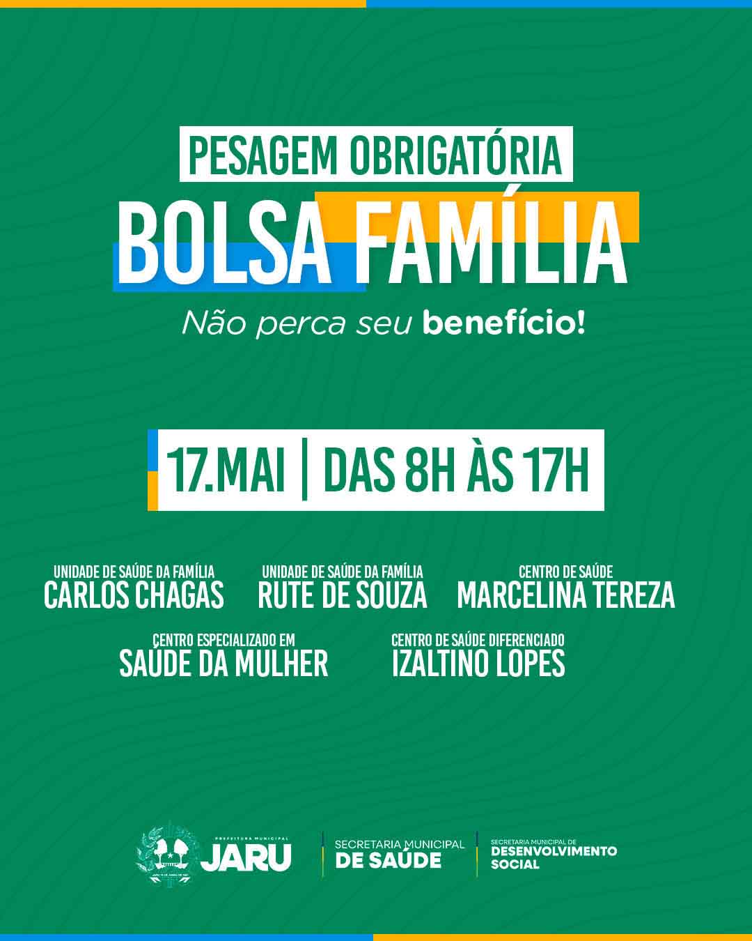 Acontece neste sábado, 17, o dia D para a pesagem obrigatória, atualização do cartão de vacina e das informações do Cadastro Único de todos os beneficiários do Bolsa Família em Jaru.