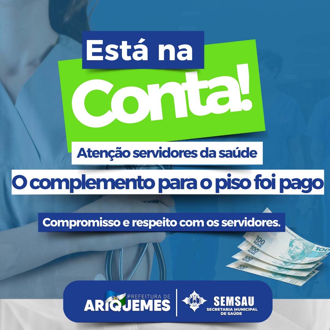 A Prefeitura de Ariquemes, através da Secretaria Municipal de Saúde - SEMSAU, realizou na manhã desta segunda-feira (25), o pagamento do complemento da união para o piso da enfermagem (enfermeiros, técnicos e auxiliares), seguindo as normas da portaria do Ministério da Saúde, nº1135/2023.