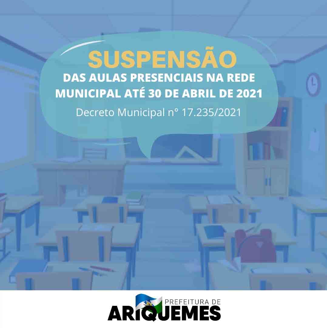 A Prefeitura de Ariquemes publicou na última segunda-feira (24), o Decreto Municipal n° 17.235/2021, que suspende as aulas presenciais na Rede Municipal de Ensino até o dia 30 de abril de 2021. Durante este período, serão ofertados às crianças/estudantes o ensino remoto, conforme Plano de Retorno de cada instituição escolar.