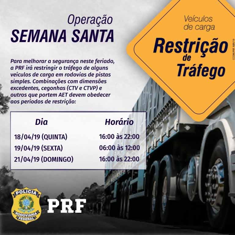 A restrição tem o objetivo de aumentar a fluidez do trânsito e diminuir o risco de acidentes nas rodovias de pista simples, maior parte da malha viária do país. Portanto, caminhões bitrens com dimensões excedentes, caminhões cegonhas e de transporte de veículos e cargas paletizadas devem obedecer à restrição e não trafegar nos seguintes dias e horários. Confira as restrições de tráfego pelo link: https://www.prf.gov.br/portal/policiamento-e-fiscalizacao/restricao-de-trafego