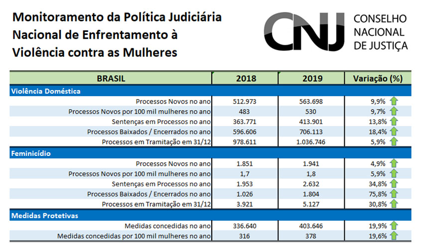 Nos casos de violência doméstica, houve aumento de quase 10%, com o recebimento de 563,7 mil novos processos. Os casos de feminicídio que chegaram ao Judiciário cresceram 5% em relação a 2018