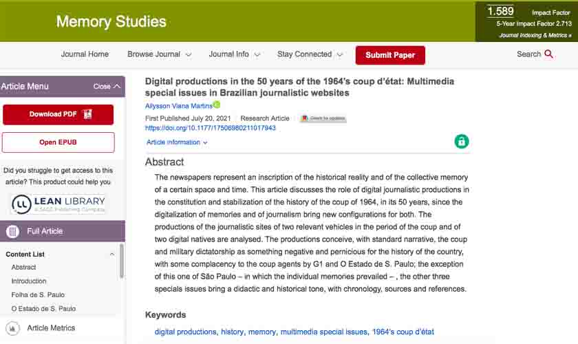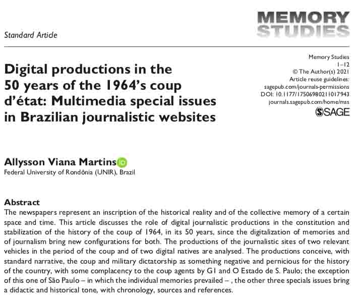 A principal revista acadêmica mundial sobre os estudos da memória publicou o artigo de Allysson Martins, professor de Jornalismo e coordenador do MíDI na Universidade Federal de Rondônia (UNIR). A versão OnlineFirst do artigo "Digital productions in the 50 years of the 1964's coup d'etat" já está disponível para que os leitores interessados tenham acesso antes da incorporação do texto em edição própria do periódico científico.
