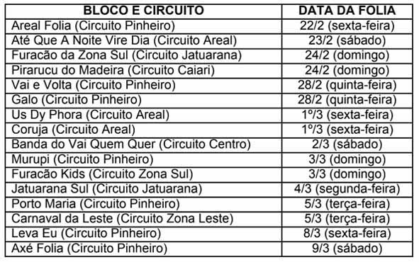 Para contagiar os foliões, nesta sexta-feira (22/02), desfila o primeiro bloco, o Areal Folia, no Circuito Pinheiro. No sábado (23/02), será a vez do bloco Até Que a Noite Vire Dia, no Circuito Areal. No domingo (24/02), será a vez do bloco Furacão da zona Sul, no Circuito Jatuarana.