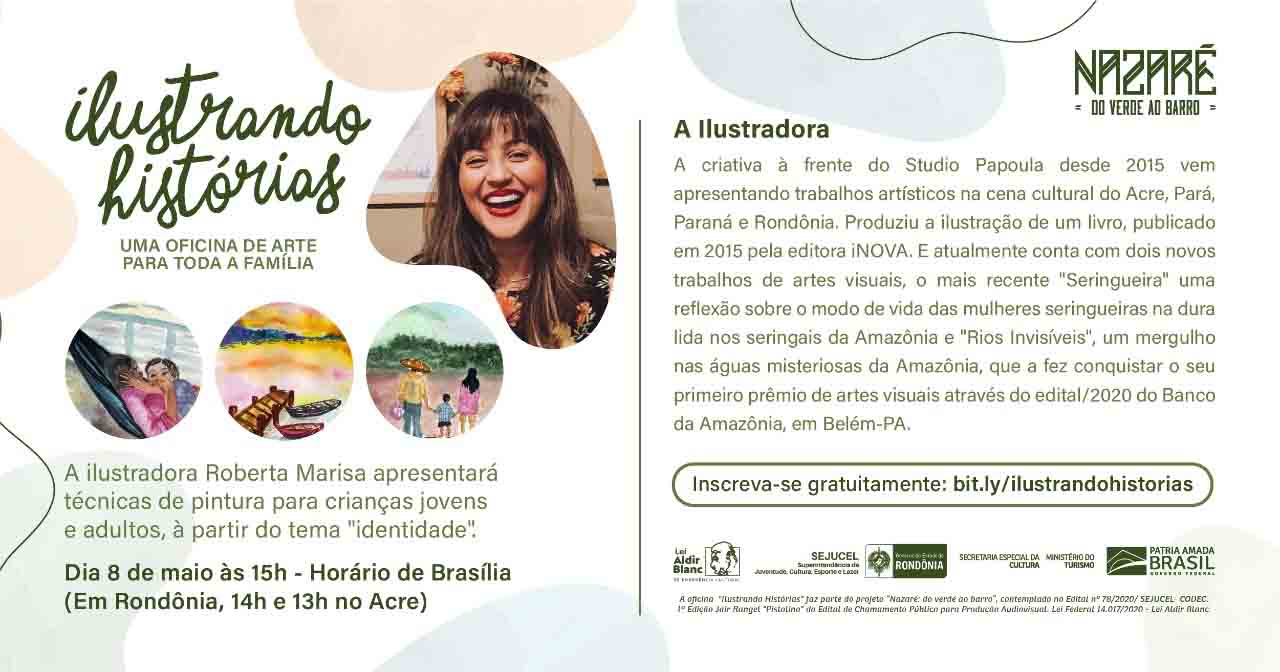 Abertas as inscrições para oficina Ilustrando Histórias - uma oficina de arte para toda a família, que será ministrada pela artista acreana Roberta Marisa, como parte da programação de lançamento do filme animação “Nazaré: do verde ao barro”, inspirado no distrito de Nazaré, no baixo Madeira de Porto Velho. A oficina é gratuita e para participar, basta preencher o formulário. As vagas são limitadas.