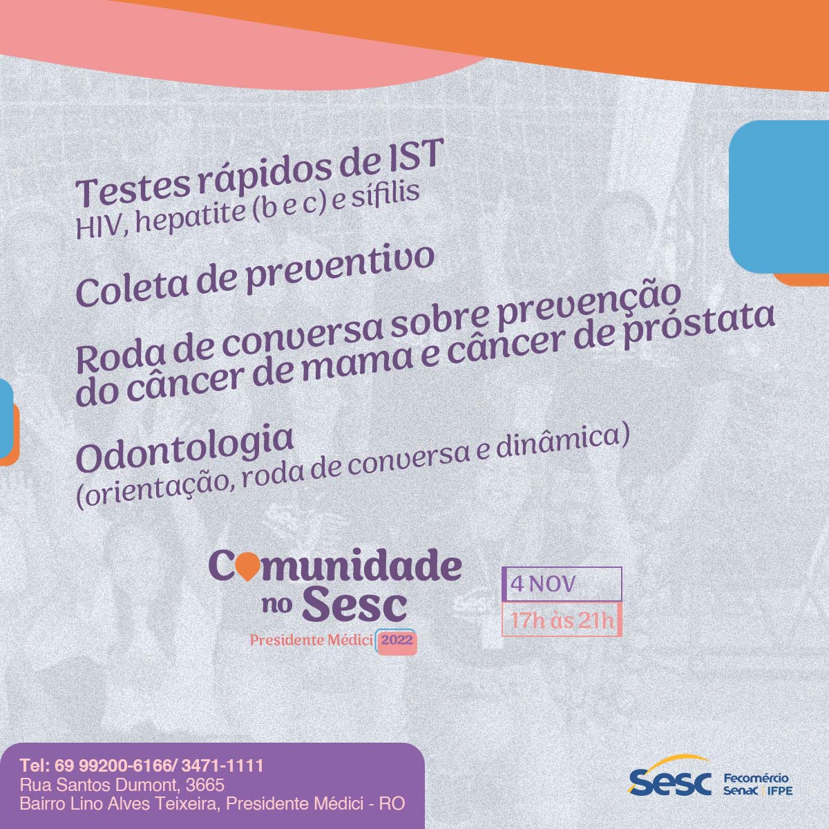 O Sistema Fecomércio/Sesc/Senac/IFPE, por meio do Sesc Rondônia, realiza em Presidente Médici, no dia 04 de novembro, a edição 2022 do “Comunidade no Sesc” – projeto que tem como objetivo realizar ações que resultem no bem-estar dos trabalhadores do comércio, bem como da comunidade em geral. Para isso, a unidade do Sesc no município ofertará atendimentos nas áreas de educação, saúde, cultura, lazer e assistência, das 17h às 21h, de forma gratuita.