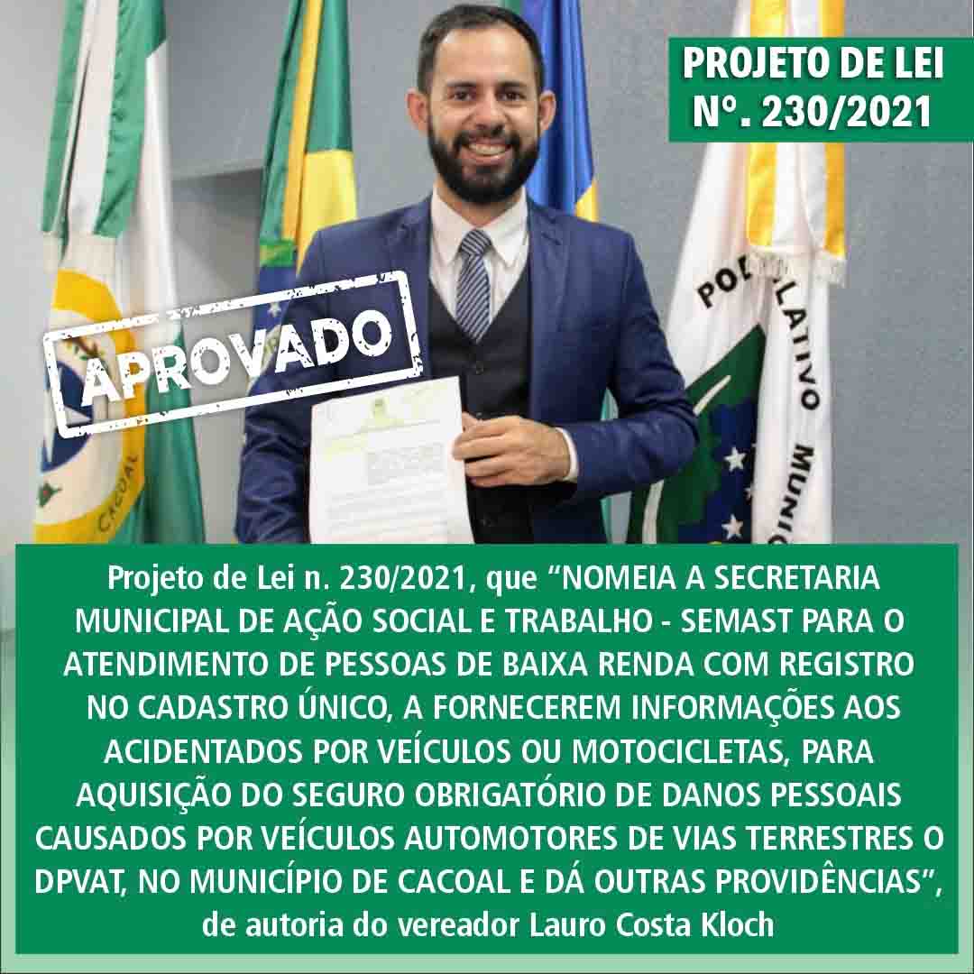 A Câmara municipal de Cacoal, aprovou de forma unânime, durante a 33ª Sessão Ordinária, realizada na segunda-feira (25), o projeto de lei de autoria do vereador Lauro Kloch (PSD), que consiste na nomeação da Semast, para atendimento de pessoas de baixa renda cadastradas no (Cadúnico), no fornecimento de informações as vítimas de acidente de trânsito, (veículos automotores), a aquisição do seguro (DPVAT), no âmbito da cidade de Cacoal.
