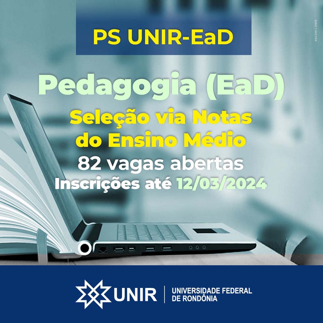 As inscrições gratuitas para concorrer às vagas no curso de graduação em Pedagogia EaD da UNIR seguem até o dia 12 de março de 2024, exclusivamente de modo online, por meio deste link: https://sistemas.unir.br/discente/login.xhtml.