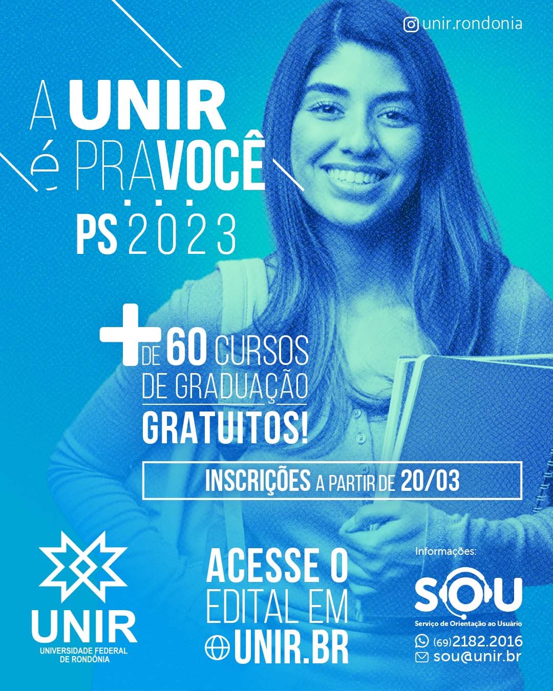 A UNIR publicou na segunda-feira, dia 13, o Edital do Processo Seletivo Discente 2023, o PS UNIR 2023, que vai selecionar 2.650 novos alunos para 60 cursos de graduação oferecidos em todos os campi da Universidade. O Edital do PS UNIR 2023 e todos os seus anexos e detalhamentos estão disponíveis no Portal de Processos Seletivos da UNIR. Como destaca a reitora da UNIR, professora Marcele Pereira, a inscrição no PS UNIR é a principal porta de entrada para os cursos de graduação da Instituição, e a que seleciona a maior parte dos novos estudantes da única Universidade Federal de Rondônia. “Neste ano o período de inscrições está maior, para que mais gente possa escolher com mais tempo um dos 60 cursos que estão com vagas abertas. Agora com as atividades totalmente retomadas, a UNIR está preparada para receber novas alunas e alunos, e estamos ansiosos para conhecer e iniciar as atividades com nossos novos estudantes”, disse a reitora da UNIR.