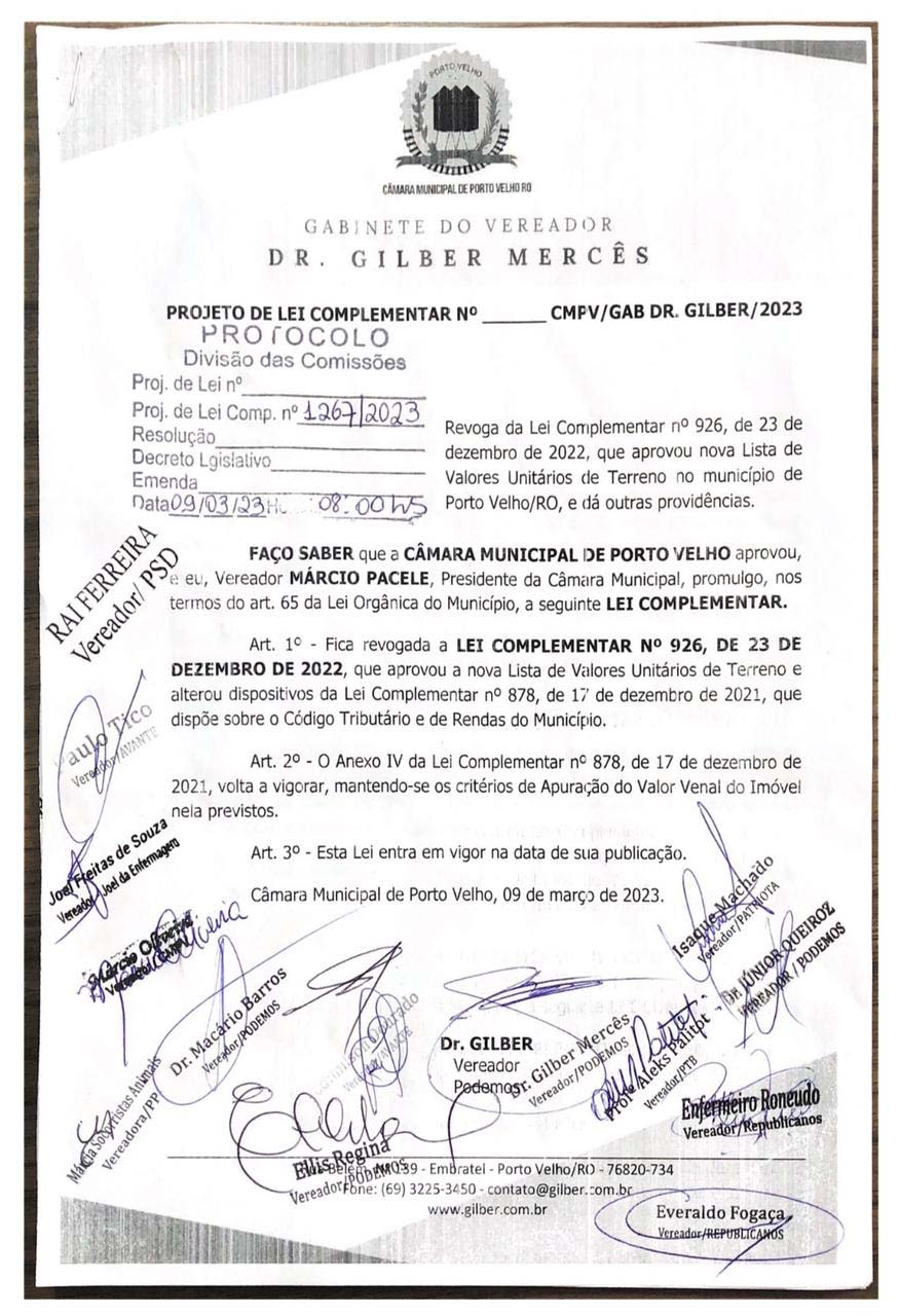Porto Velho, RO - Quatorze vereadores de Porto Velho assinaram o Projeto de Lei Complementar nº 1267/2023 que revoga a Planta Genérica dos dos terrenos da capital.