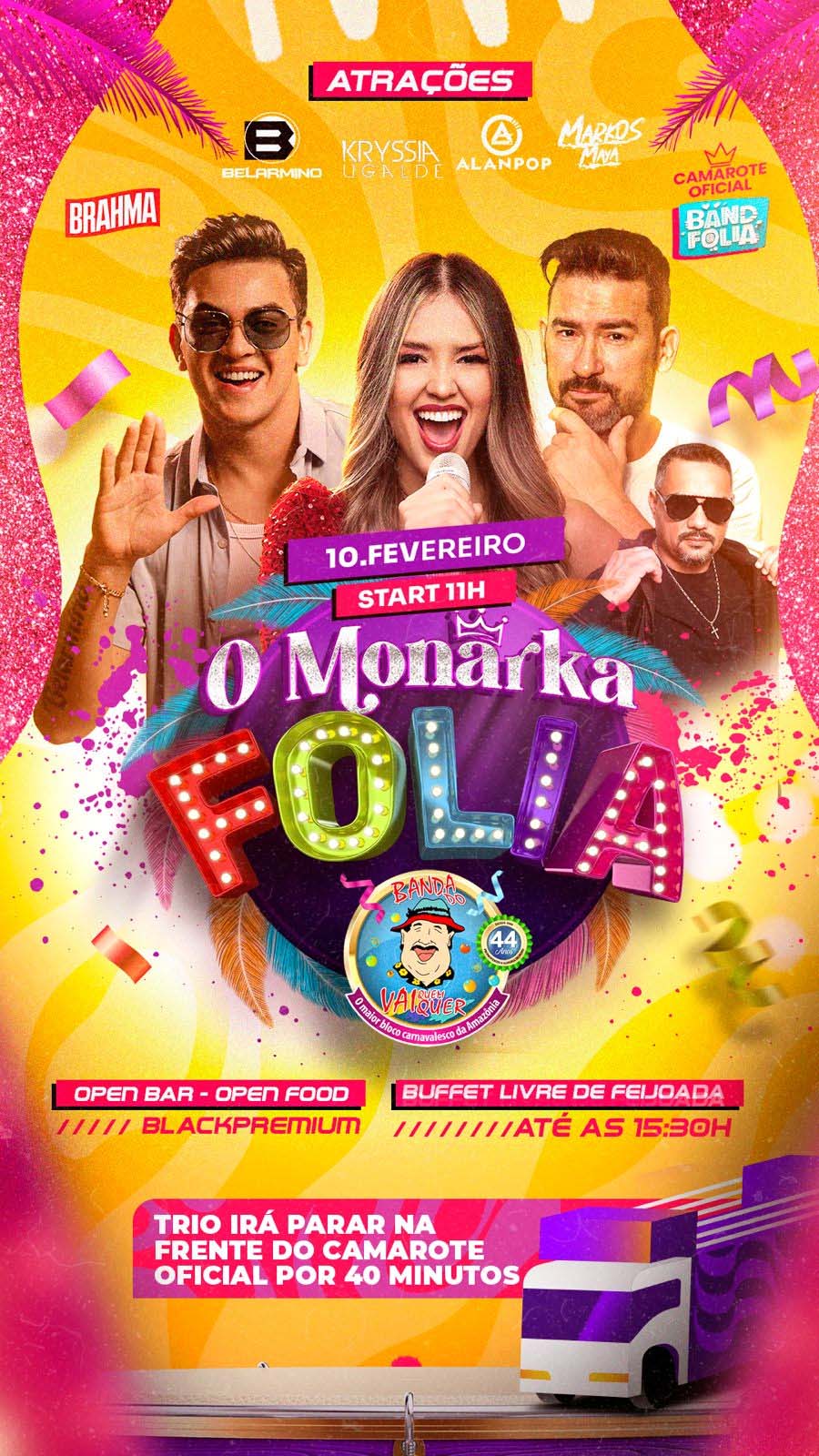 "Seremos o único camarote oficial da Banda do Vai Quem Quer, da Brahma e da Band Folia", afirmou o empresário Sinezio Tapajós, da conceituada casa de shows O Monarka, considerada um novo conceito de entretenimento, lazer e gastronomia de alta qualidade, se referindo ao evento gastronômico e carnavalesco 'Monarka Folia', que acontece neste sábado de carnaval, dia 10, a partir das 11h, com feijoada e muito shows. O evento terá 15h de duração.