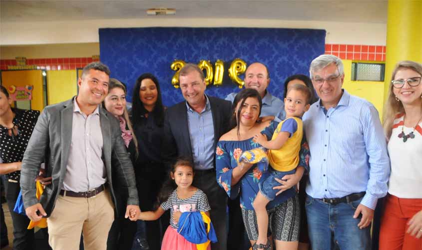 Com a presença de pais, vereadores, secretários municipais, servidores e do prefeito de Porto Velho, Hildon Chaves, foi oficialmente aberto o ano letivo das escolas municipais. O evento aconteceu na manhã desta última quarta-feira (6/2), na unidade de Educação Infantil Mãe Margarida, no bairro Jardim Santana, setor Leste da cidade. A escola atende 350 crianças, com idades entre 3 e 5 anos e gerou, para este ano, 114 novas vagas. Outras três novas salas estão sendo construídas e devem ser entregues até março.
