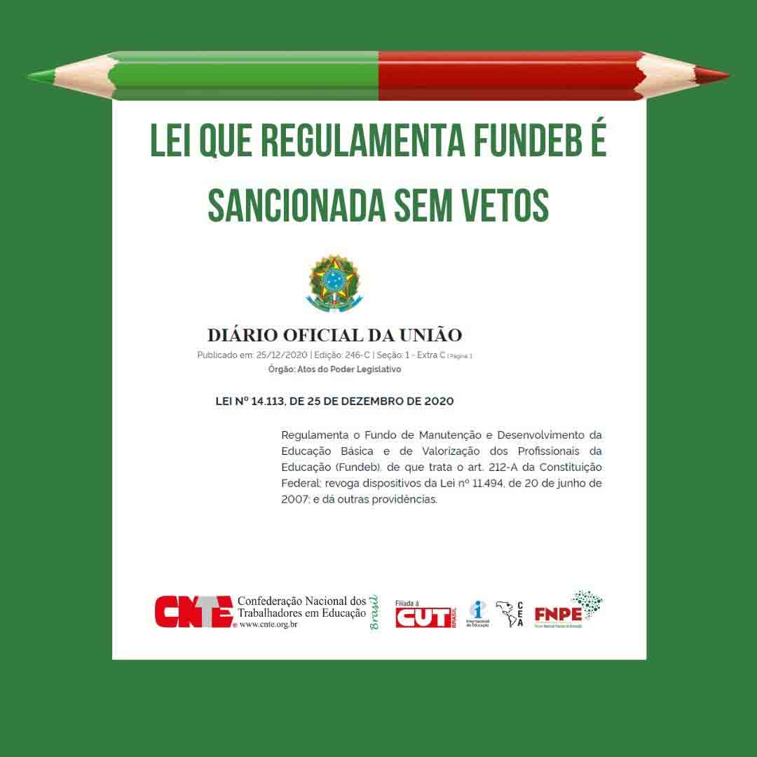 A Lei nº 14.113, que regulamenta o Fundo de Manutenção e Desenvolvimento da Educação Básica e de Valorização dos Profissionais da Educação (Fundeb), de que trata o art. 212-A da Constituição Federal e revoga dispositivos da Lei nº 11.494, de 20 de junho de 2007, foi sancionada pelo Palácio do Planalto sem vetos e publicada no Diário Oficial da União do dia 25/12/2020.