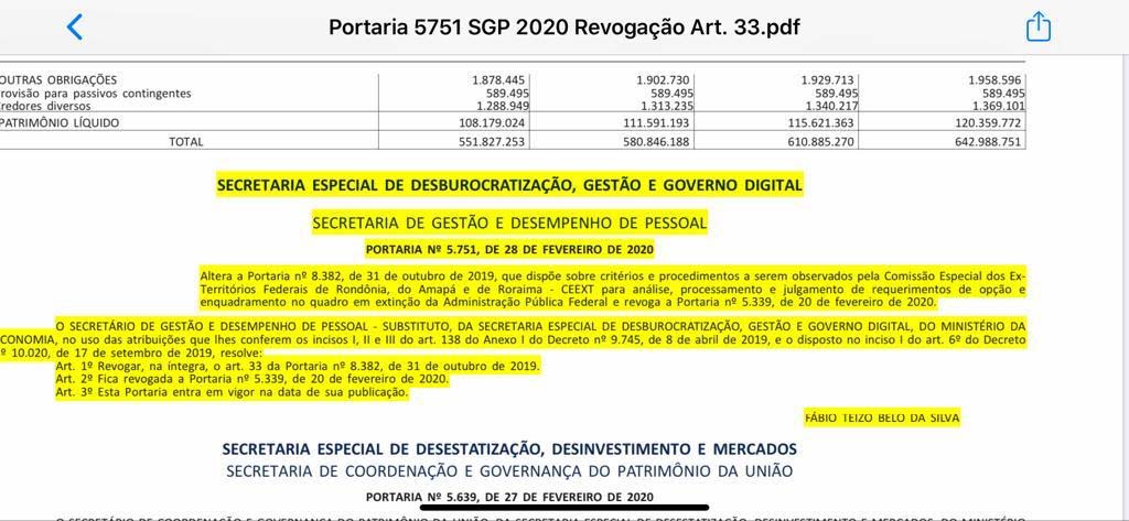 A Secretaria Especial de Desburocratização, Gestão e Governo Digital, após denúncia do Nahoraonline e consequente pressão por parte da bancada federal de Rondônia, revogou o artigo 33 da Portaria 8.382 de 31 de outubro de 2019 que manteve ainda a possibilidade de suspensão do processo administrativo, uma vez que o servidor ingresse na Justiça demanda do mesmo teor, assunto tratado em reunião realizada no último dia 12 de fevereiro com a bancada federal, onde teve a promessa descumprida causando indignação entre os parlamentares e servidores.
