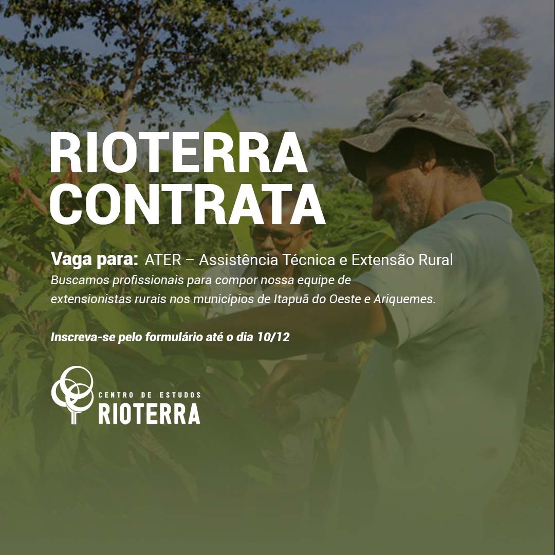 O Centro de Estudos Rioterra está com três processos seletivos abertos até o dia 10 de dezembro para contratação de quatro técnicos de ATER - Assistência Técnica e Extensão Rural com lotação em Itapuã do Oeste e Ariquemes, de um encarregado de Logística e de um coordenador de RAD – Recuperação de Áreas degradadas. Os dois últimos com lotação em Porto Velho.