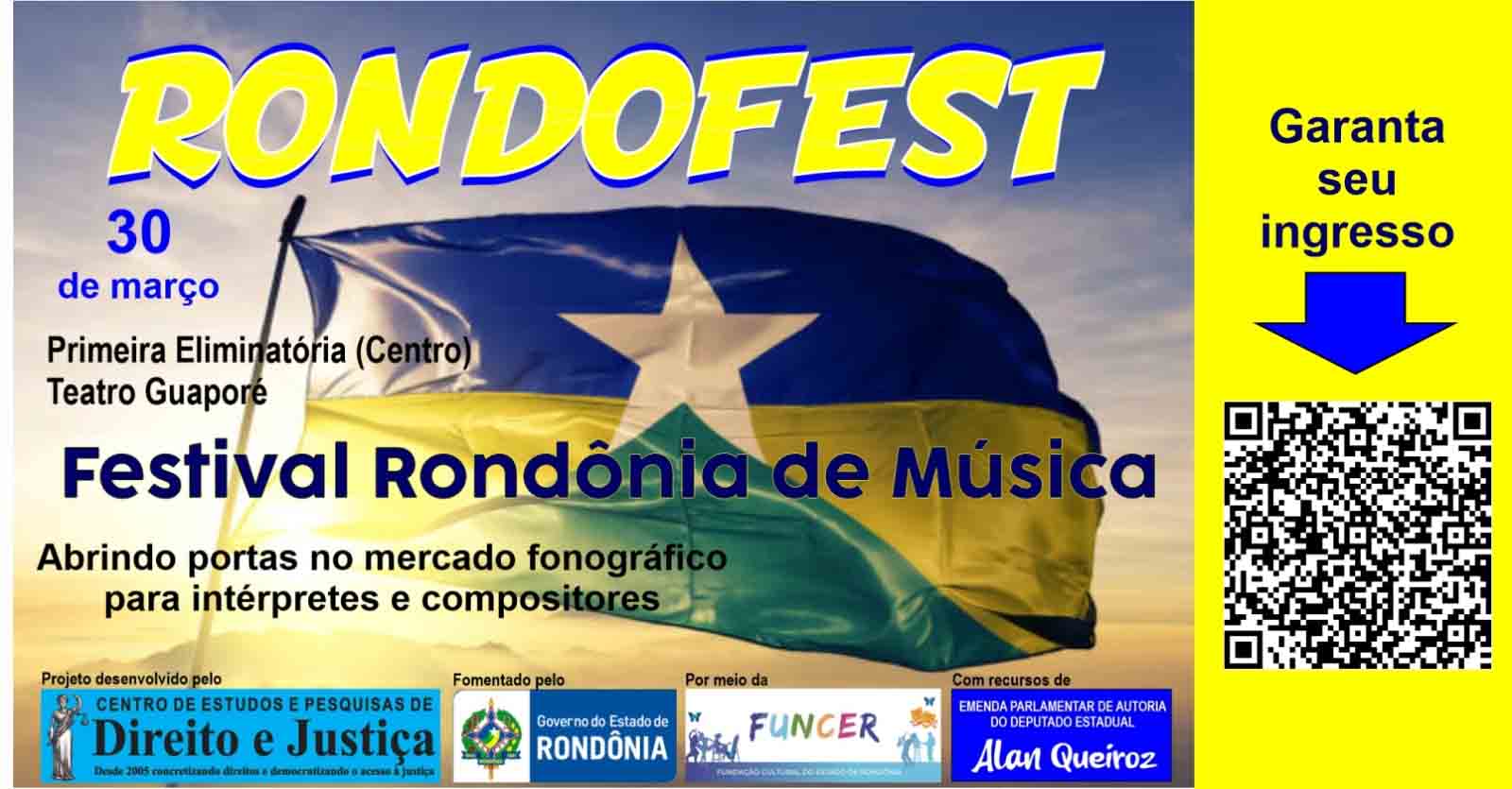 O Festival Rondônia de Música (Rondofest) realiza neste domingo, 30 de março, a primeira etapa de sua fase eliminatória, no Teatro Guaporé, a partir das 17h00. O certame constitui a fase seletiva do projeto Registro Cultural, que apoiará intérpretes e compositores rondonienses no registro, proteção, defesa e gestão de seus direitos autorais e fonográficos.