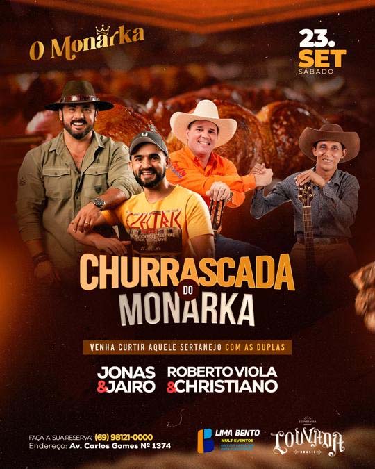"Venha no sábado desfrutar com a sua família do nosso almoço pantaneiro com aquela churrascada, do nosso varal de legumes e carnes nobres acompanhado daquele modão de viola", convidou o empresário Sinezio Tapajós, do O Monarka, o novo conceito de entretenimento, lazer e gastronomia de alta qualidade de Pvh, O Monarka.