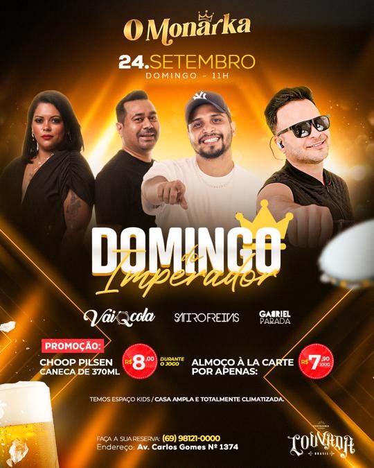 O "Domingo do Imperador", tem hora pra começar, às 11, e prosseguirá o domingo à noite com almoço à quilo, promoção de chopp Pilsen, transmissão do jogo decisivo entre Flamengo X São Paulo, com shows antes e após a decisão da final da Copa do Brasil.
