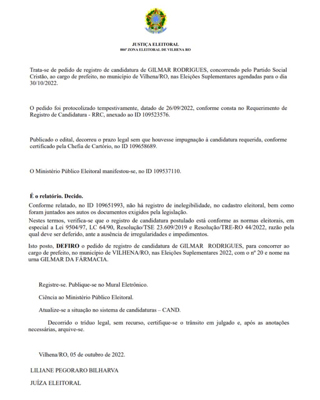 O empresário e professor evangélico Gilmar da Farmácia saiu na frente na corrida eleitoral para a Prefeitura de Vilhena: nesta quarta-feira, 5 de outubro, às 15 horas 14 minutos e 6 segundos ele foi o primeiro a obter aprovação de seu pedido de registro de candidatura pela Justiça Eleitoral. A decisão emitida pela juíza eleitoral Liliane Pegoraro destacou que “o registro de candidatura está conforme as normas eleitorais” e deve ser aprovado “ante a ausência de irregularidades e impedimentos”.