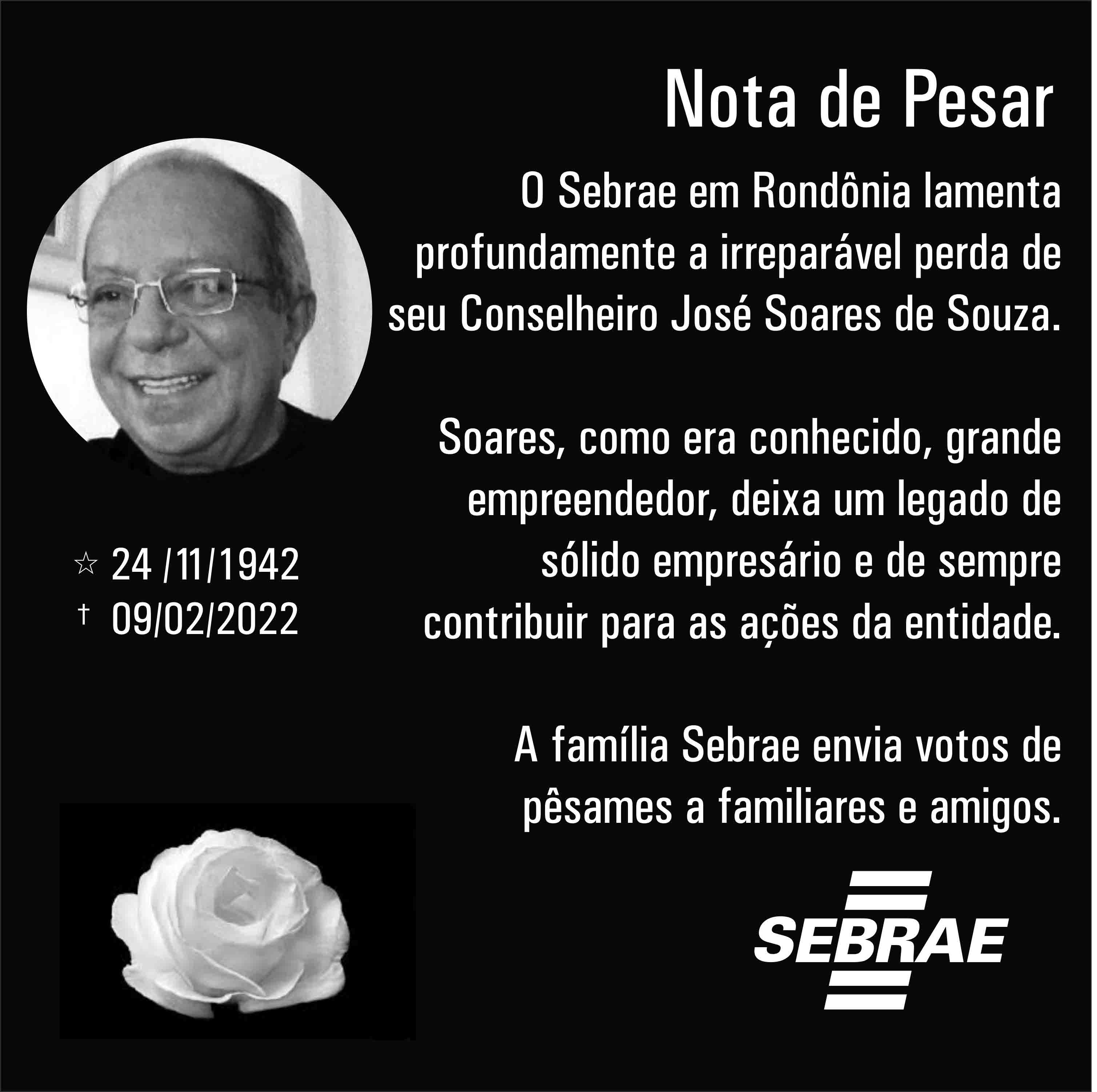 É com pesar que o Conselho Deliberativo Estadual do Sebrae em Rondônia - CDE recebe a notícia do falecimento do Sr. José Soares de Souza, Conselheiro Suplente, representante da Federação das Câmaras de Dirigentes Lojistas - FCDL.