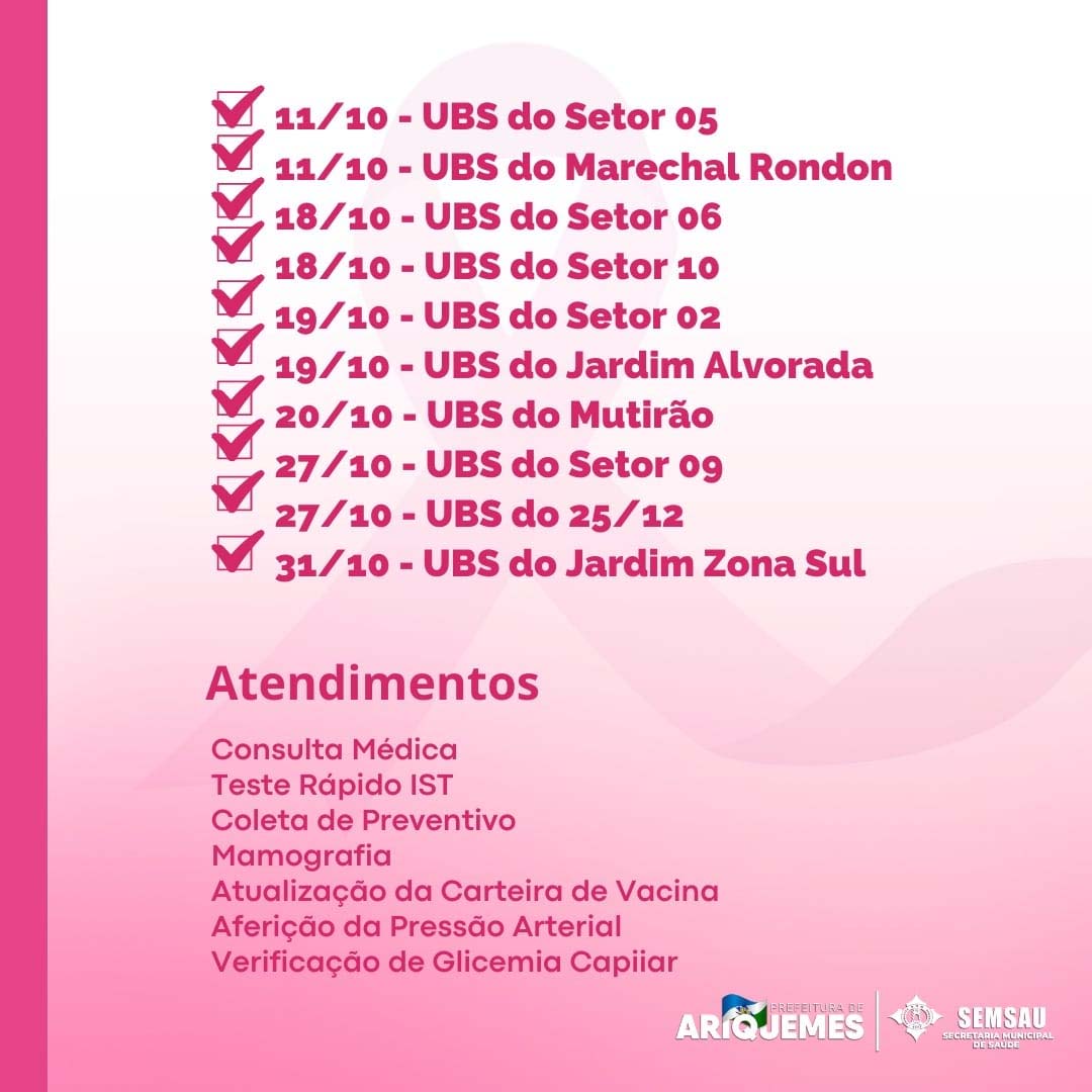 A Secretaria Municipal de Saúde - Semsau, em atenção à campanha Outubro Rosa, mês de prevenção ao câncer de mama e do colo do útero, realizará ações noturnas voltadas à saúde da mulher.
