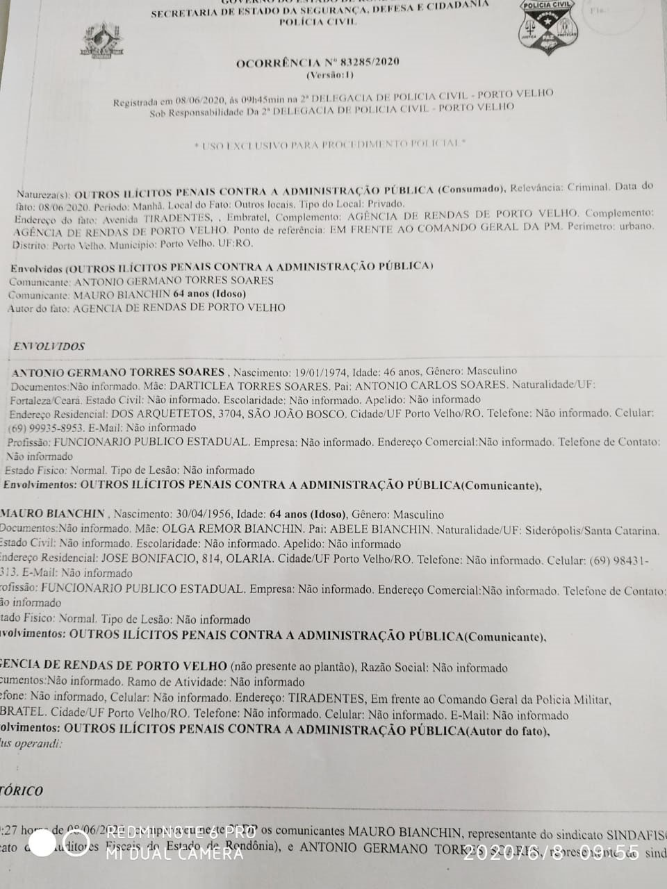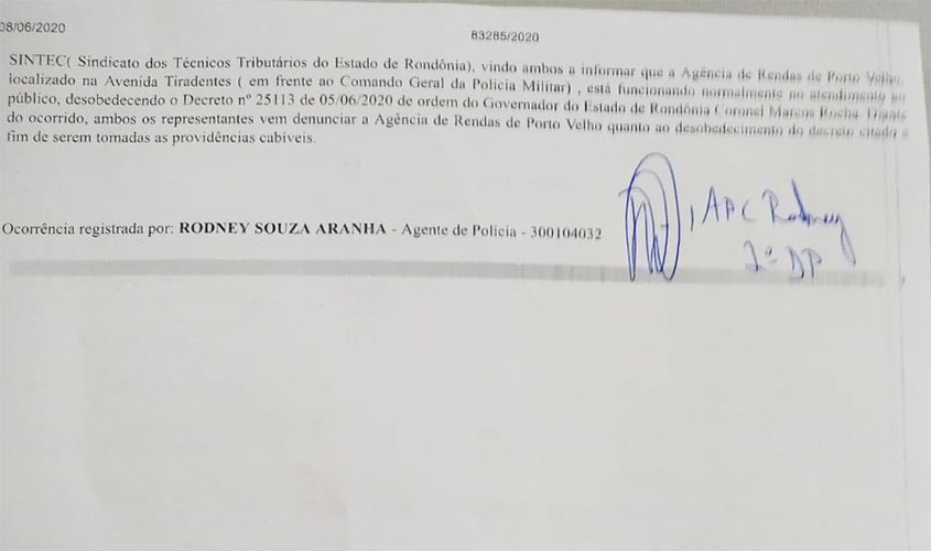 O Sindicato dos Auditores Fiscais de Tributos de Rondônia (Sindafisco) e do Sindicato dos Técnicos Tributários do Estado (Sintec) registraram boletim de ocorrência (Nº 83285/2020) contra a Administração Pública representada pelo Secretário de Finanças de Rondônia, Luis Fernando Pereira da Silva descumprimento do Decreto N° 25.113, de 5 de junho de 2020, de ordem do Governador do Estado de Rondônia, que suspendeu totalmente as atividades e serviços não essenciais na capital e Candeias do Jamari.