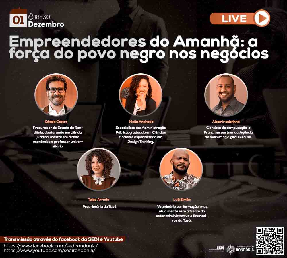 A Superintendência Estadual de Desenvolvimento Econômico e Infraestrutura (Sedi) do Governo de Rondônia, realiza nesta terça-feira (1) uma live sobre “os empreendedores do amanhã: a força do povo negro nos negócios”. A transmissão online acontecerá às 18h30, através do página social da Superintendência.