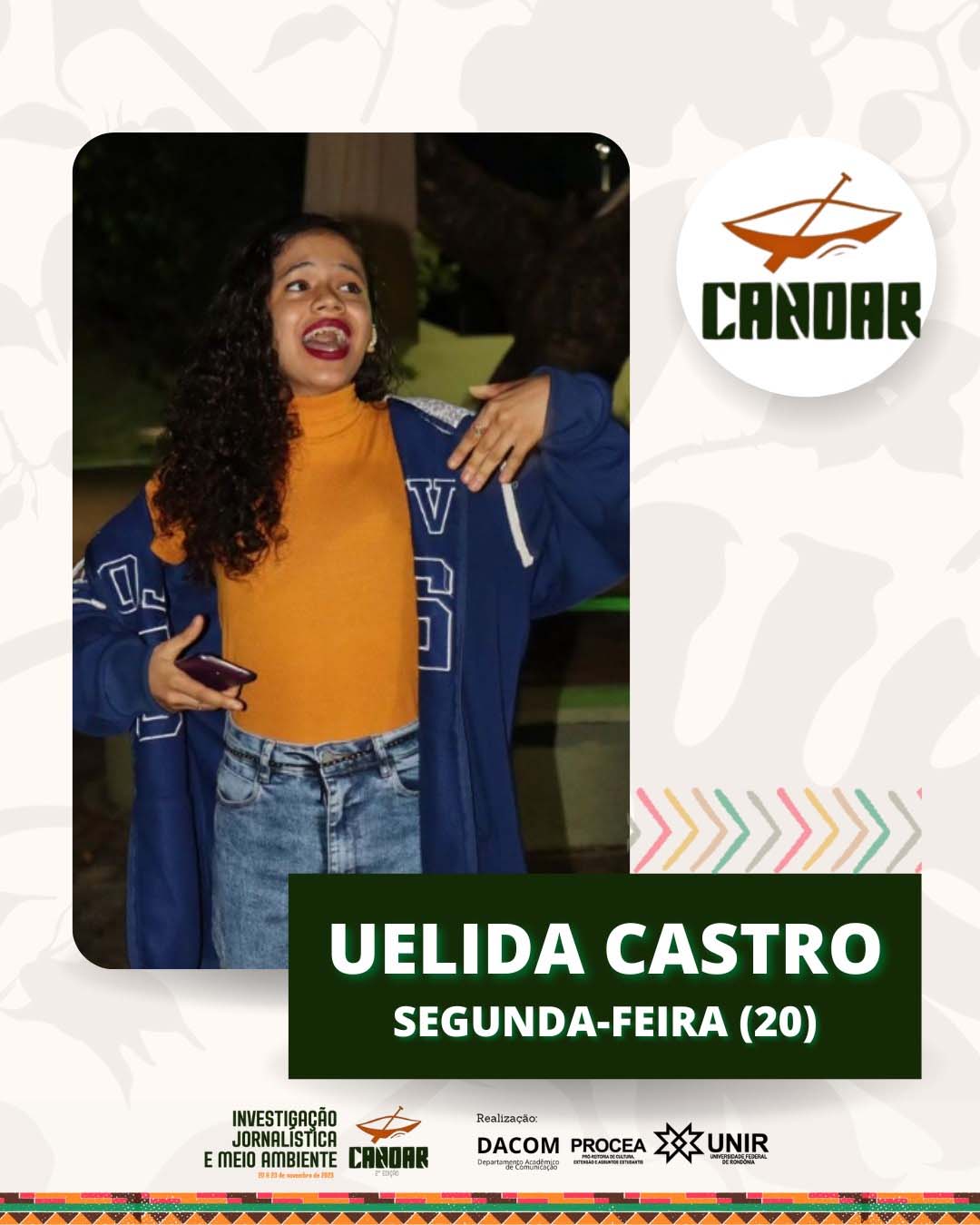 Uélida Castro, uma jovem de apenas 15 anos, destaca-se na representatividade da poesia periférica rondoniense. A poetisa venceu o Slam Rondônia, o Campeonato Rondoniense de Poesia e Perfomance em 2023 e representará nosso estado em Itabira-MG, no Slam Brasil em dezembro. Ao falar sobre seu comprometimento com questões sociais, ela afirma: "Como jovem estudante e artista, tenho me dedicado a questões relacionadas ao racismo estrutural e às crises climáticas que contribuem para os aglomerados subnormais. Tenho me expressado por meio da arte poética, denunciando as estruturas e estigmas que compõem a realidade em que nossa sociedade está imersa", finalizou.