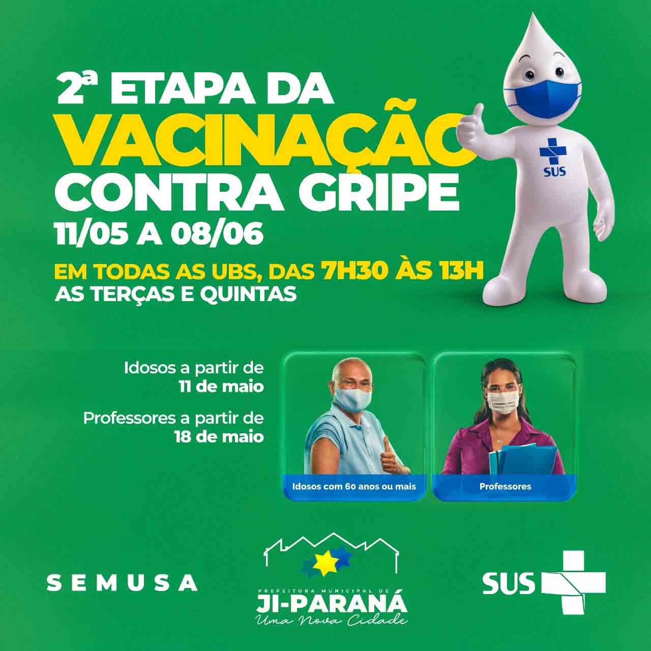 Começa hoje, terça-feira (11), a segunda etapa da Campanha Nacional de Vacinação contra a Gripe (influenza), com a vacinação de idosos a partir de 60 anos. Na próxima terça-feira (18), a Prefeitura de Ji-Paraná, por meio da Secretaria Municipal de Saúde (Semusa), inicia a imunização para os professores.