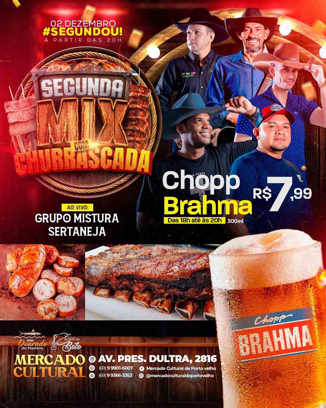 "Hoje, dia 02, tem a considerada melhor noite de segunda-feira da capital rondoniense, estou falando da nossa 'Segunda Mix Com Churrascada', que começa a partir das 19h, com show do grupo Mistura Sertaneja no palco do Mercado Cultural de Pvh", enfatizou o empresário Sinésio Tapajós, permissionário do box Dourado do Madeira, acrescentando que vai ter promoção de chopp Brahma (copo de 300ml), das 18h às 20h, por apenas R$ 7,99.