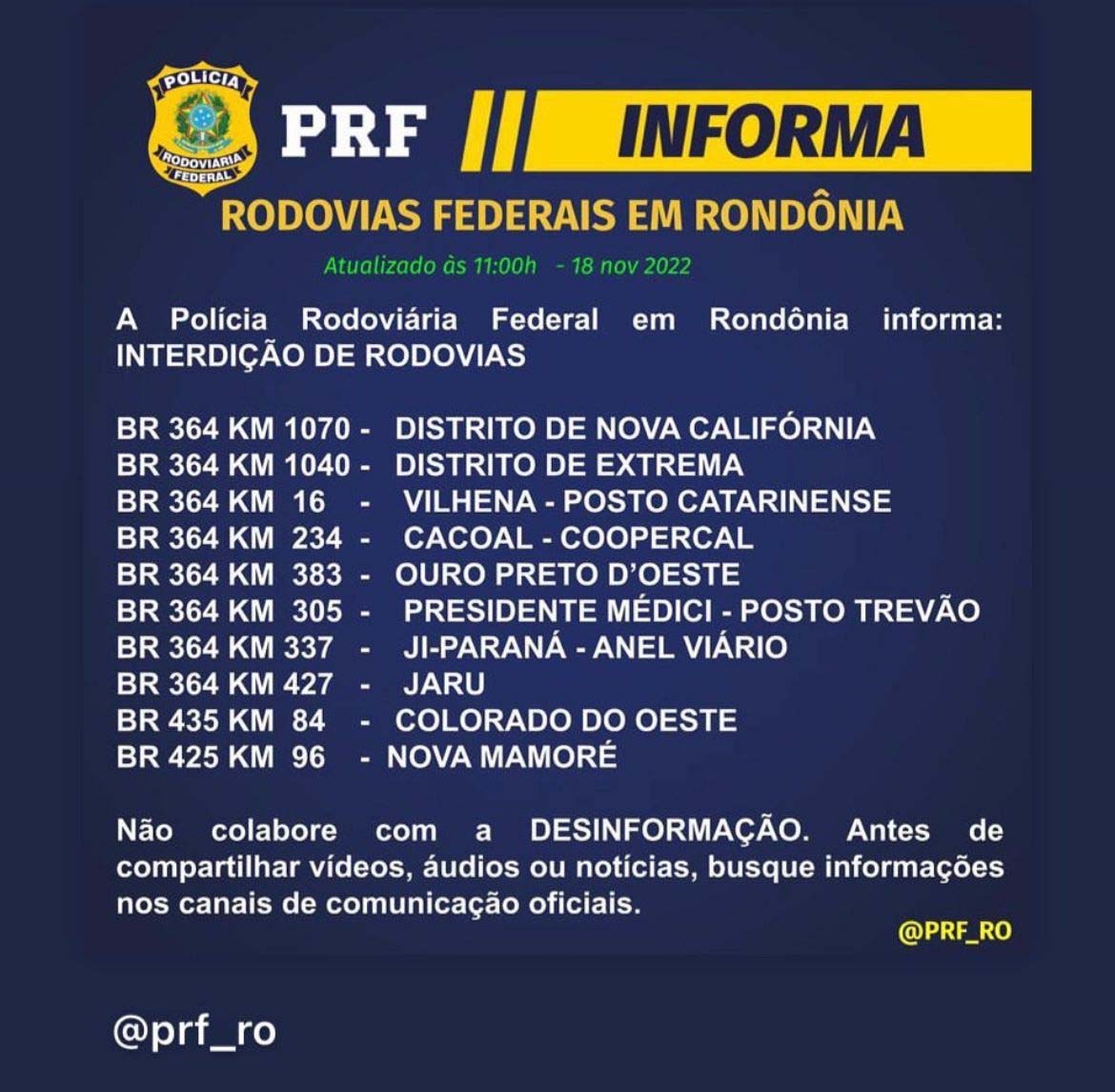 Até às 11 horas foram registrados bloqueios nos municípios de Cacoal, Vilhena, Presidente Médici, Ji-Paraná, Jaru, Ouro Preto do Oeste, Colorado do Oeste, Nova Mamoré e nos distritos de Nova Califórnia e Extrema.