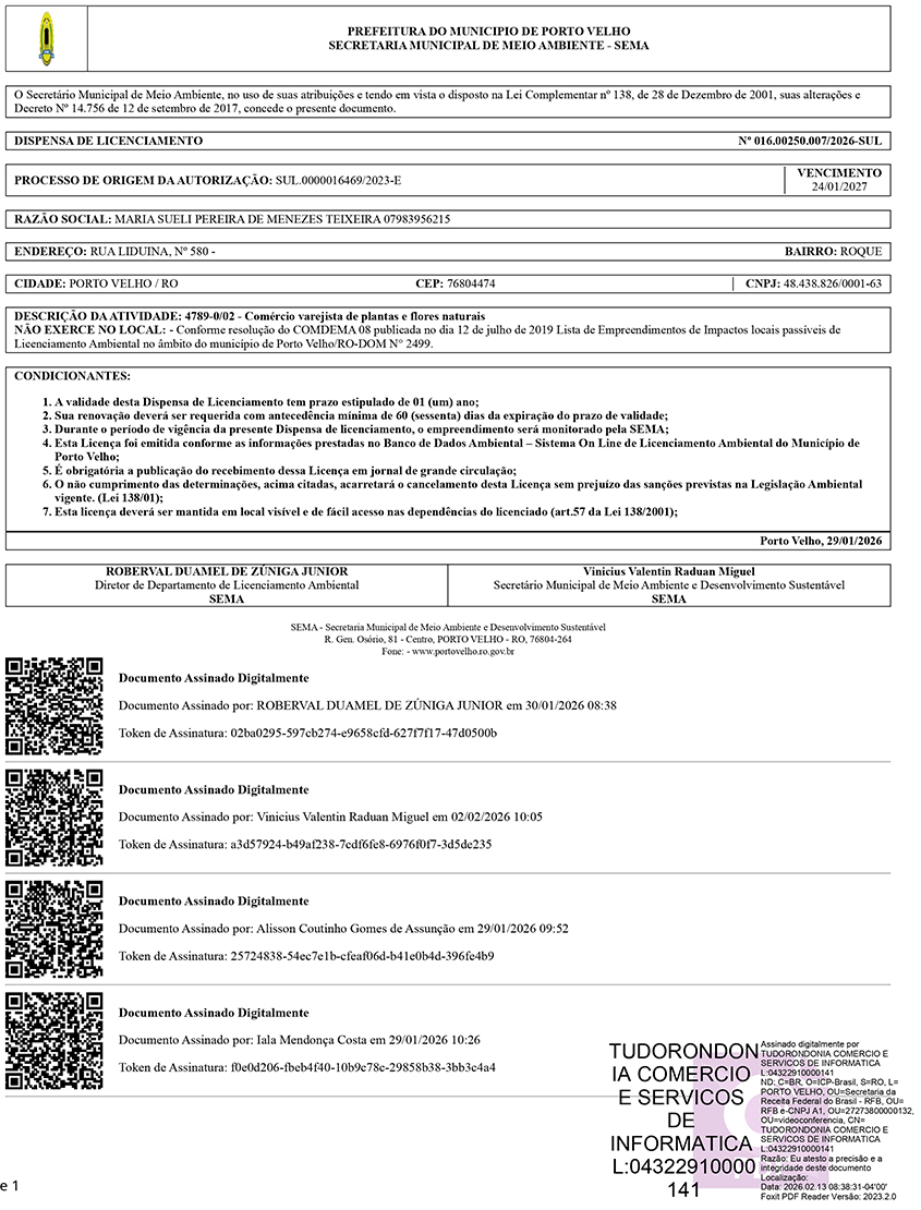 A Secretaria Municipal de Meio Ambiente e Desenvolvimento Sustentável (SEMA) concedeu Dispensa de Licenciamento Ambiental nº 016.00250.007/2026-SUL, em favor de Maria Sueli Pereira de Menezes Teixeira 07983956215, referente à atividade de comércio varejista de plantas e flores naturais, localizada na Rua Liduina, bairro Roque, em Porto Velho. A dispensa foi emitida nos termos da Lei Complementar nº 138/2001 e da Resolução COMDEMA nº 08/2019, com validade até 24 de janeiro de 2027, devendo o empreendimento cumprir as condicionantes estabelecidas pelo órgão ambiental.