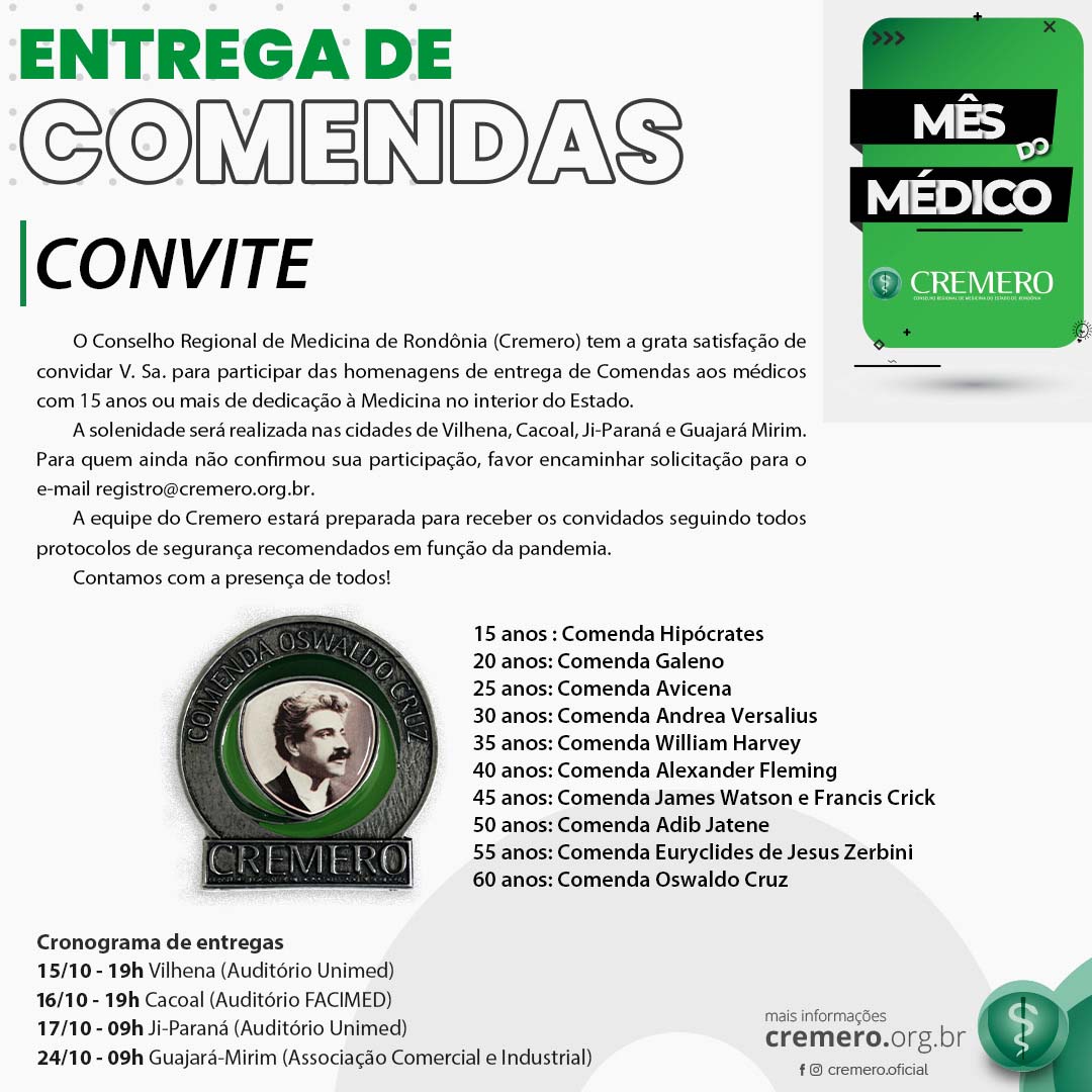 Uma semana repleta de homenagens marcará o Mês do Médico promovido pelo Conselho Regional de Medicina de Rondônia (Cremero). As festividades, iniciam nesta quinta-feira em Vilhena (15), e seguem para as cidades de Cacoal (16), Ji-Paraná (17) e Porto Velho (18). Durante as solenidades, a programação contará com a tradicional entrega de comendas para os médicos com 15 anos ou mais de dedicação à Medicina em Rondônia, homenagem aos familiares dos profissionais falecidos e também aos médicos que bravamente lutaram para manter com amor e dignidade os atendimentos durante a pandemia.
