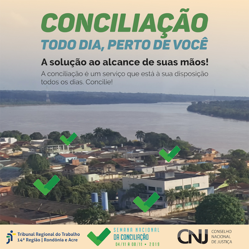 De 4 a 8 de novembro de 2019, a Justiça do Trabalho de Rondônia e Acre participará da XIV Semana Nacional da Conciliação. Desde 2006, a iniciativa é um esforço anual pela solução do maior número de processos através da mediação coordenado pelo Conselho Nacional de Justiça (CNJ) e que envolve os Tribunais de Justiça, do Trabalho e Federais.