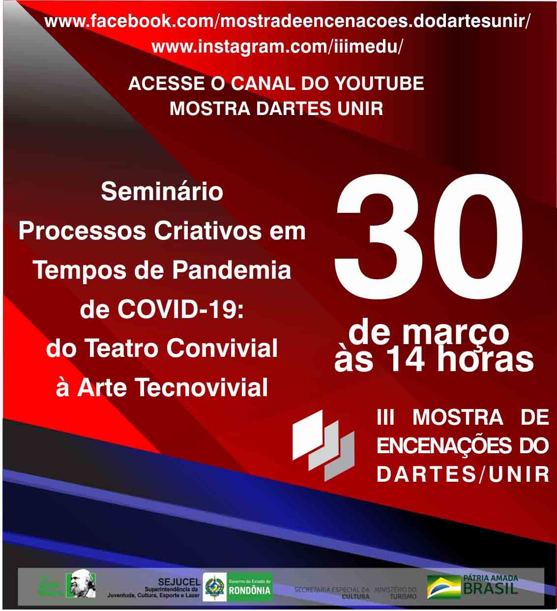 A exibição AO VIVO de espetáculos e vídeos da 3ª Mostra de Encenações do DArtes/UNIR já terminou, mas o evento ainda não! Nesta terça-feira (30/03) será realizado o Seminário “Processos Criativos em Tempos de Pandemia de COVID-19: do Teatro Convivial à Arte Tecnovivial”.