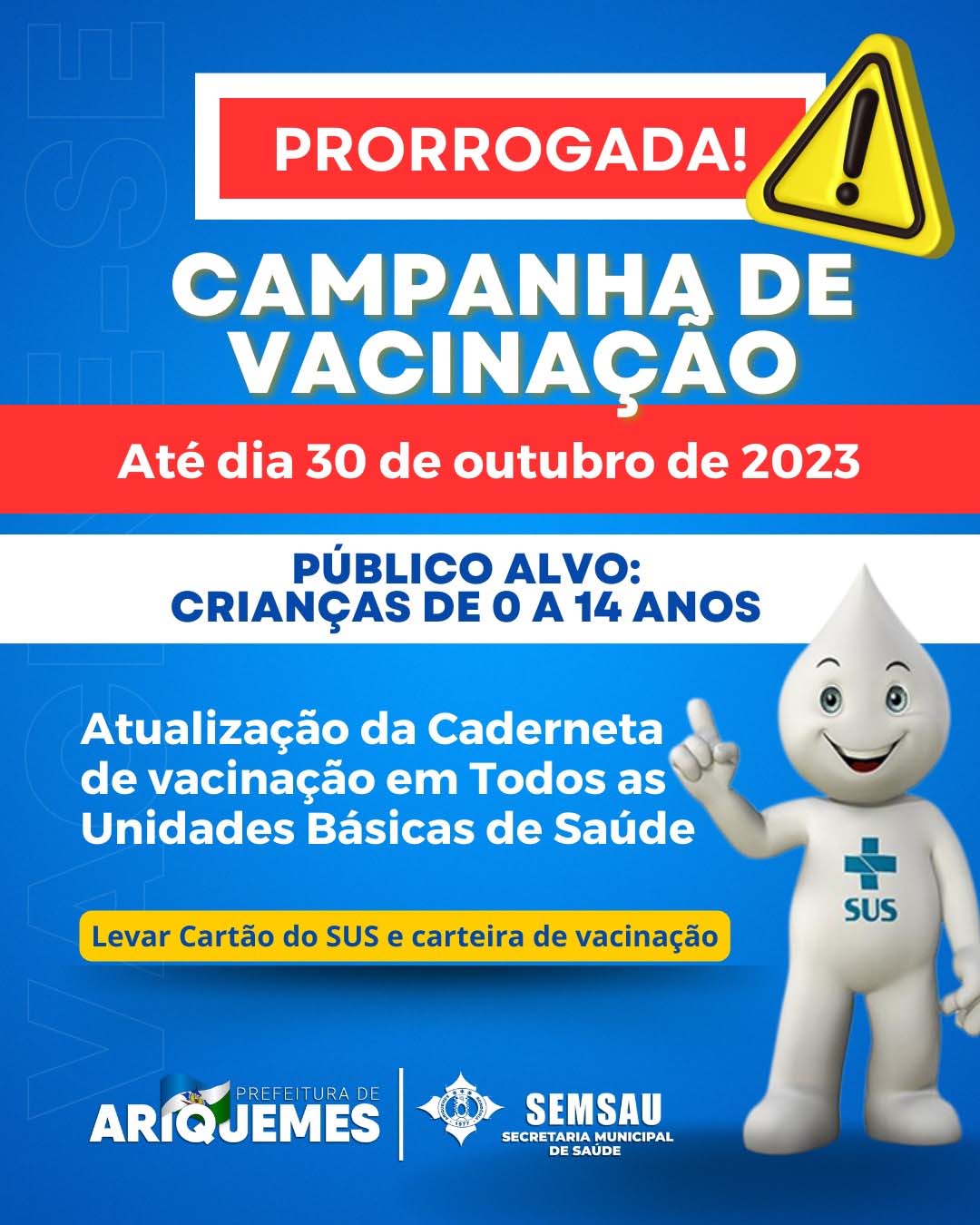 A Prefeitura de Ariquemes, através da Secretaria Municipal de Saúde - SEMSAU, prorrogou a campanha de multivacinação até o dia 30 de outubro. O público alvo são crianças e adolescentes com até 14 anos.