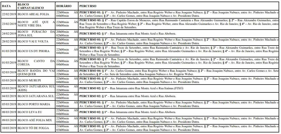A Portaria proíbe o trânsito e estacionamento de veículos, inclusive caçambas estacionárias (papa entulho), nos circuitos dos desfiles do carnaval 2019. "Exceto os veículos devidamente autorizados com a Autorização Especial de Tráfego (AET), expedida pela Semtran", informou o titular da pasta, Nilton Gonçalves Kisner.