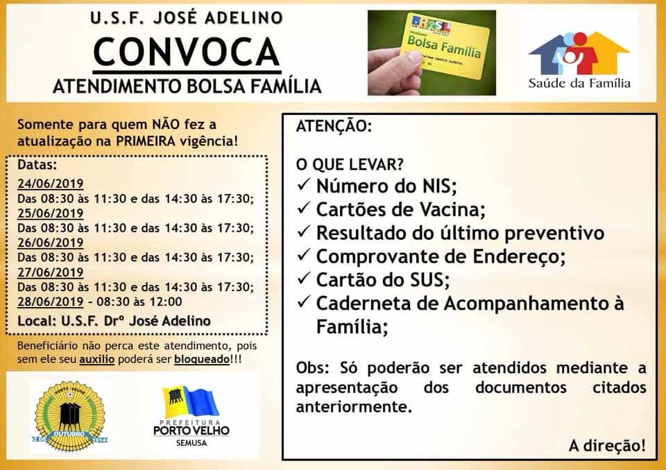 A Secretaria Municipal de Saúde de Porto Velho divulgou o calendário da Unidade de Saúde da Família José Adelino, no bairro Ulysses Guimarães, para o atendimento a beneficiários do Programa Bolsa Família, que não fizeram atualização da primeira vigência.