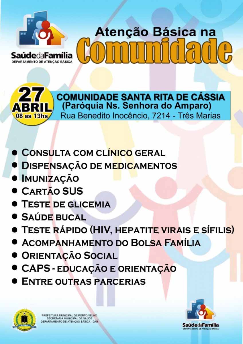 A Secretaria Municipal de Saúde de Porto Velho (Semusa) inicia, neste sábado (27/4), o calendário de atividades do projeto ‘Atenção Básica na Comunidade’. O primeiro bairro a receber a ação é o Três Marias, na zona Leste.
