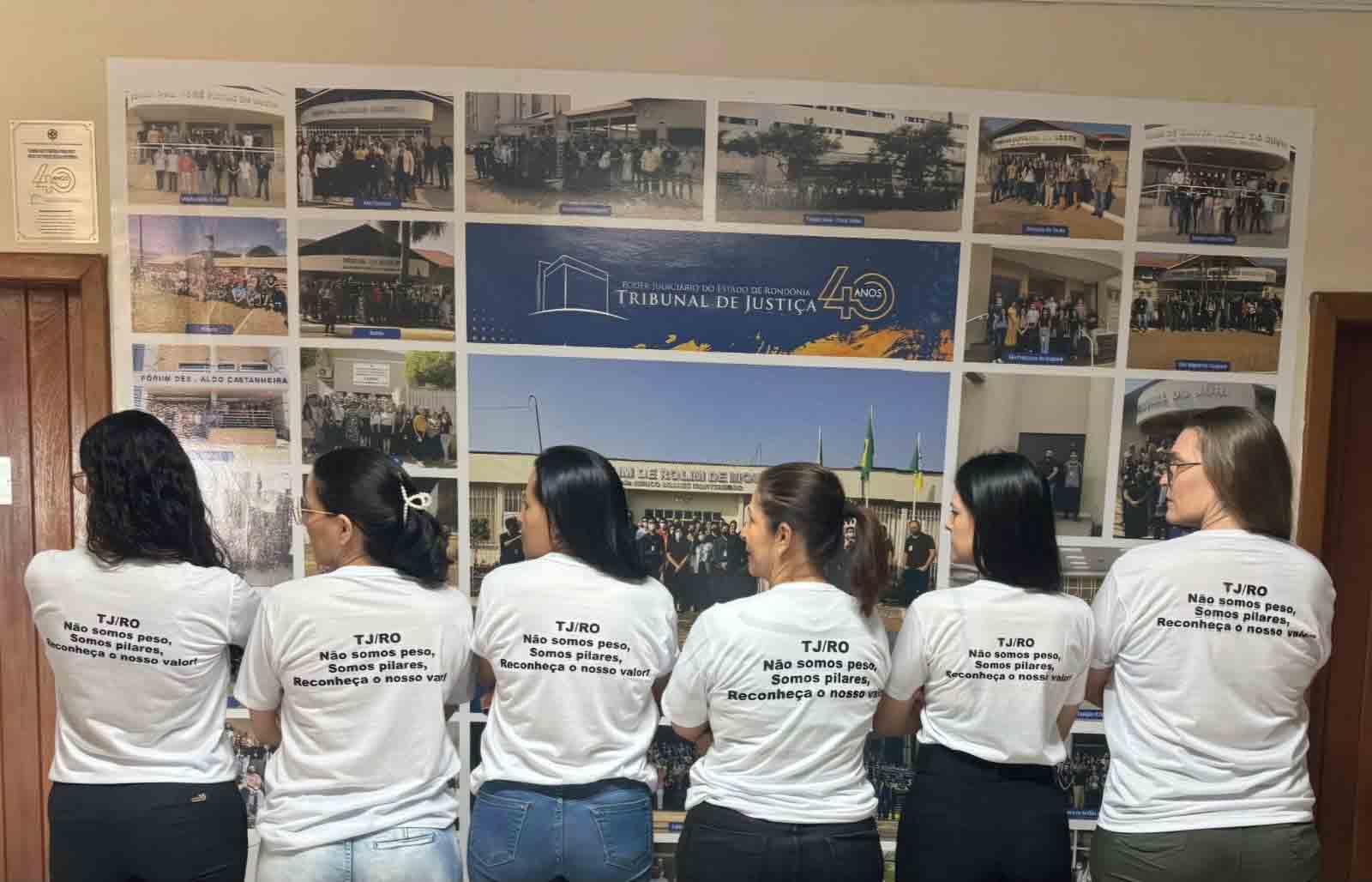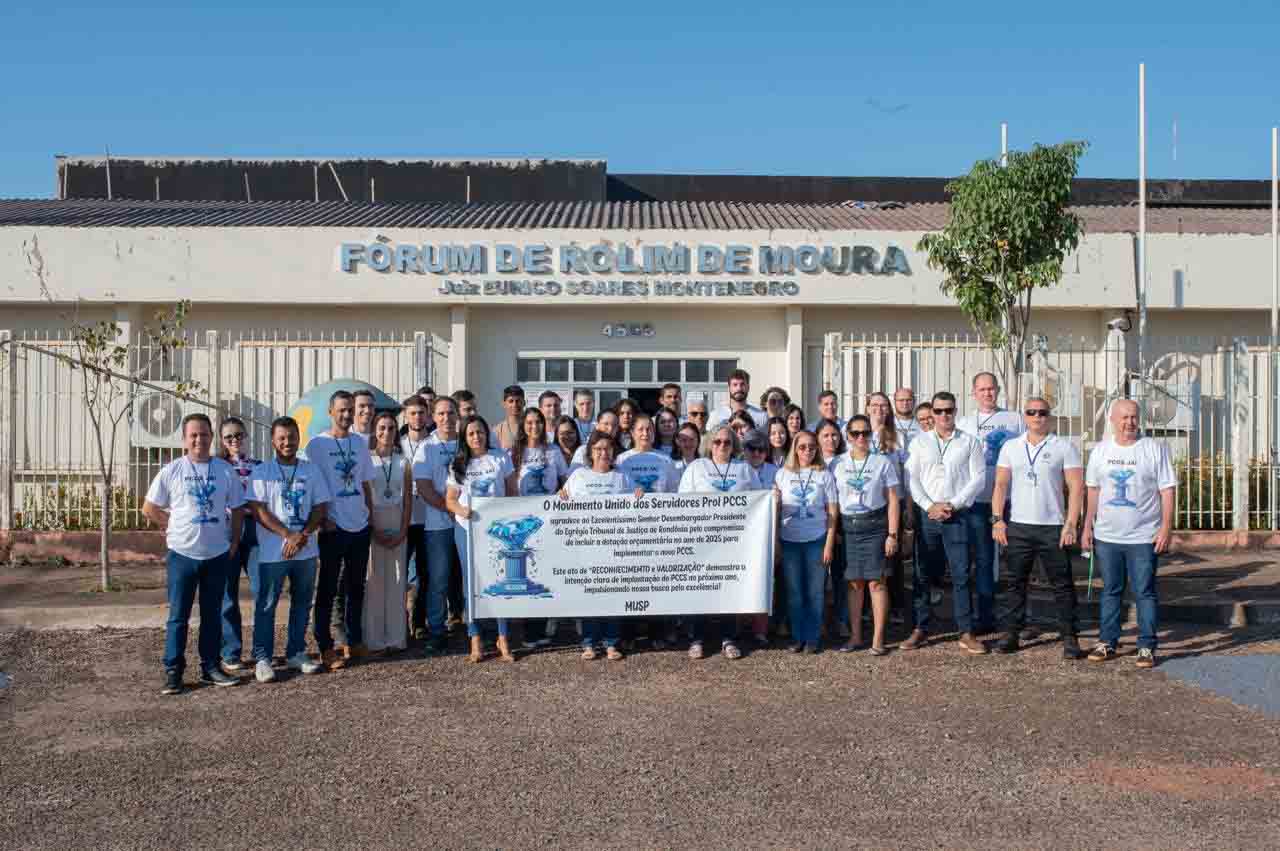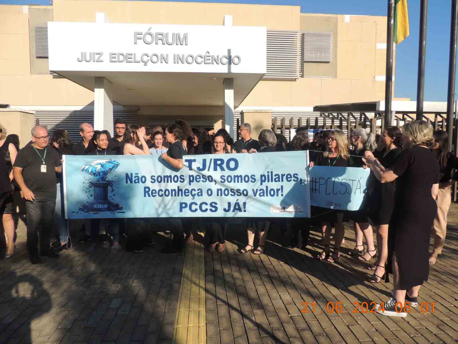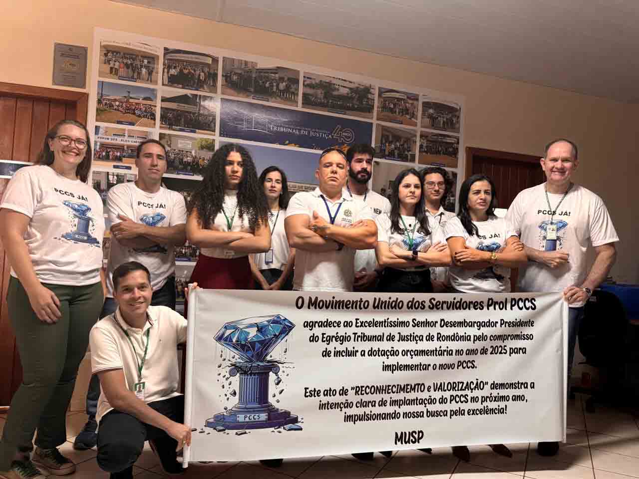 Os servidores usaram camisetas e elaboraram faixa em agradecimento ao Desembargador Presidente Tribunal de Justiça do Estado de Rondônia, pela sinalização pública de inclusão dos recursos na dotação orçamentária no ano de 2025, para implantação do novo PCCS.