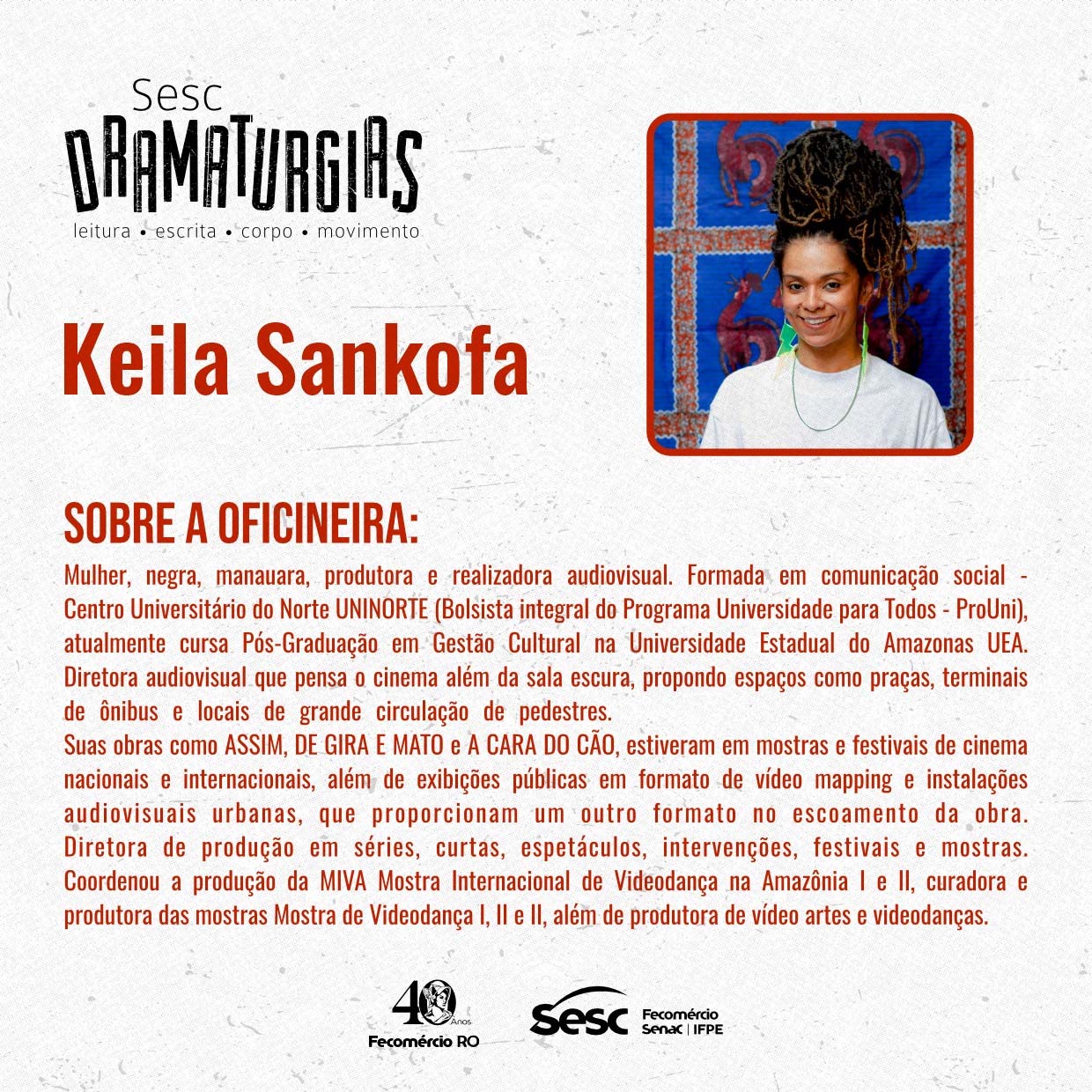 Estão abertas as inscrições para a oficina ‘Vídeo Dança’, por meio do projeto Sesc Dramaturgias, com Keila Sankofa (AM). A oficina acontece entre os dias 7 a 11 de agosto, das 18h às 22h, de forma presencial na sala de treinamento do Sesc Esplanada.