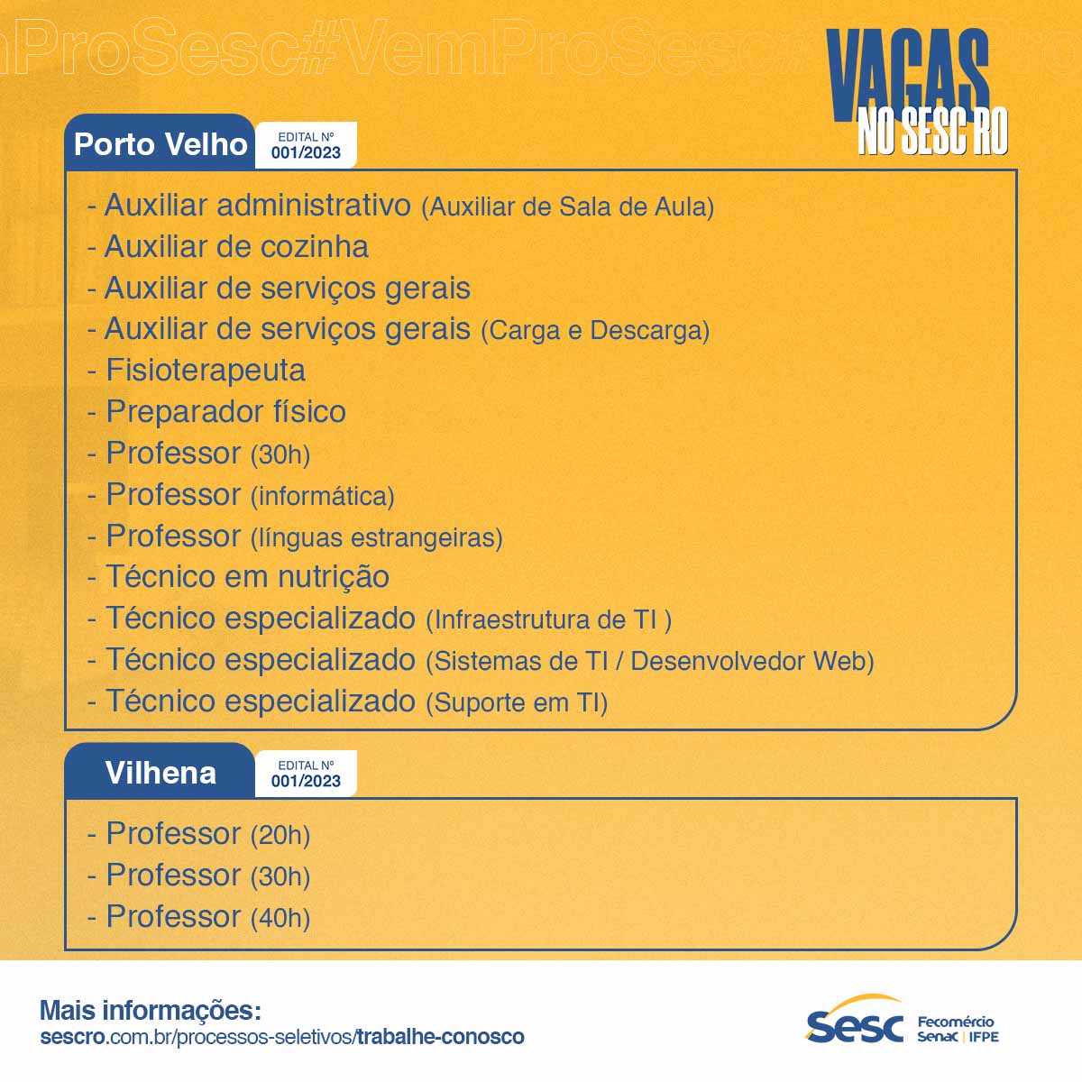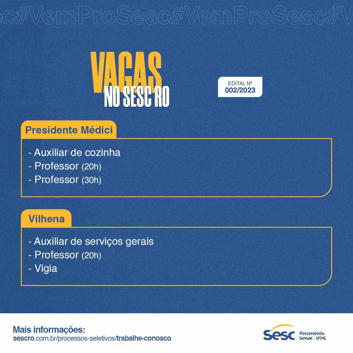 O Sistema Fecomércio/Sesc/Senac/IFPE, por meio do Sesc Rondônia, anuncia a abertura de processos seletivos para suas unidades de Porto Velho, Ariquemes, Ji-Paraná, Presidente Médici e Vilhena. As vagas são para diversos níveis de escolaridade e buscam suprir o quadro profissional da instituição por tempo determinado e indeterminado, conforme especificidades apontadas em seus editais.