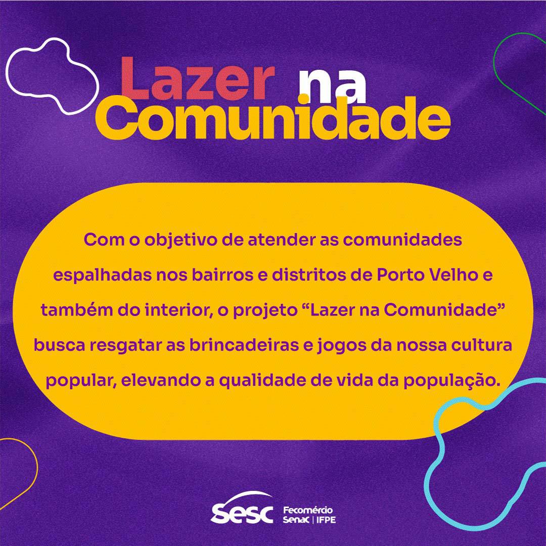 O Serviço Social do Comércio – Sesc realiza, neste final de semana, mais uma edição do projeto ‘Lazer na Comunidade’, que busca atender comunidades do interior de Rondônia e também bairros e distritos mais afastados de Porto Velho.