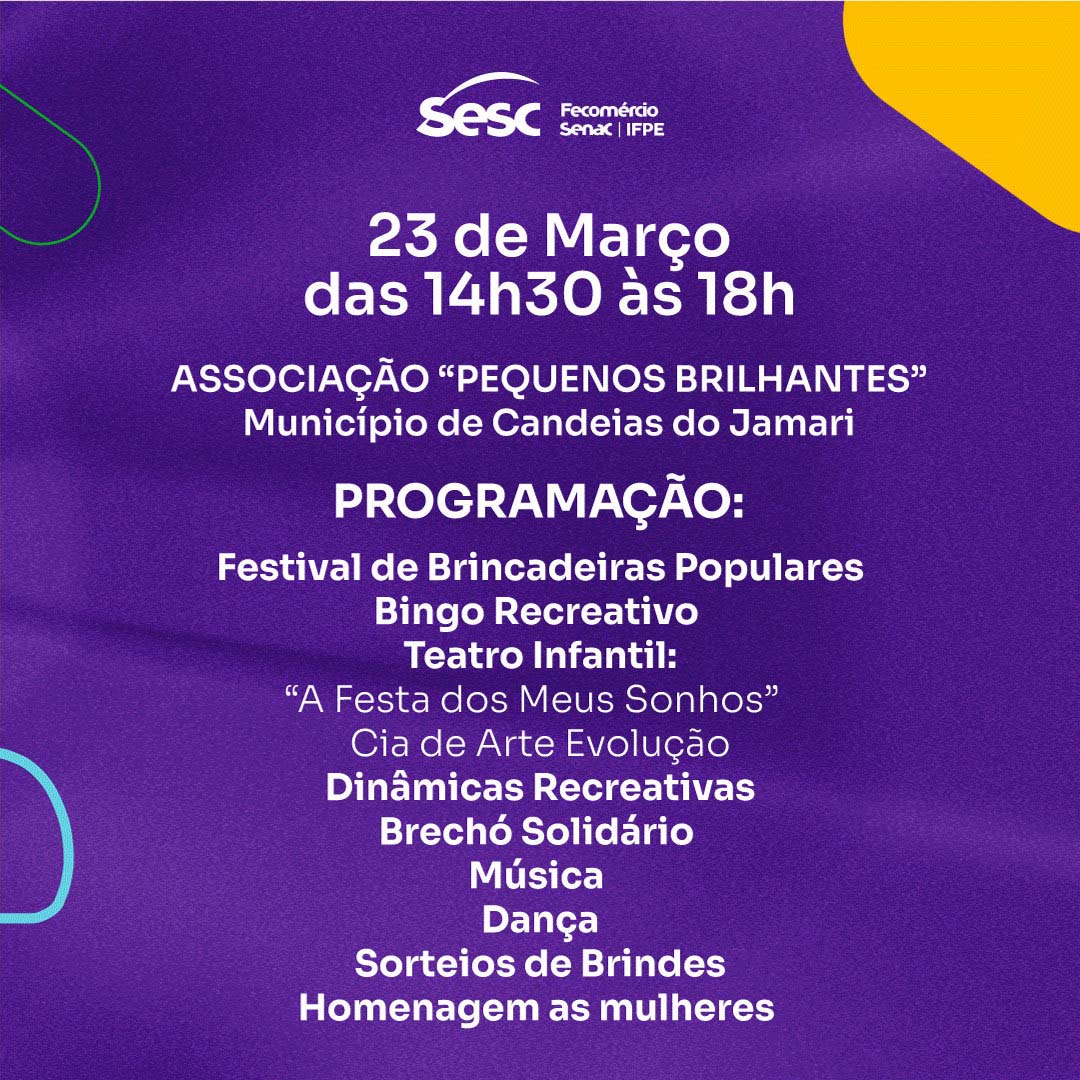 Essa 2ª edição será realizada no dia 23 de março (sábado) na associação Pequenos Brilhantes, no município de Candeias do Jamari, das 14h30 às 18h. O evento terá como público-alvo desde crianças até idosos.