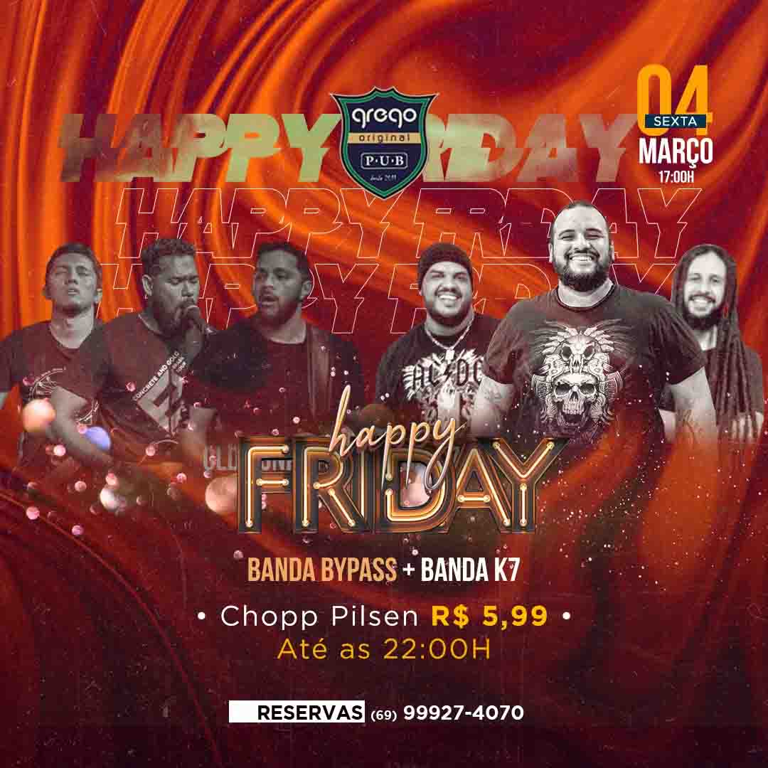 Com dois palcos e seis ambientes climatizado, inclinado um espaço kids para as pequenas "Gregas" e os pequenos "Gregos", e salão de jogos, nesta sexta-feira, a partir das 17h, tem o evento Happy Friday com shows, a partir das 19h, com as bandas Bypass, na sequência, da K7.