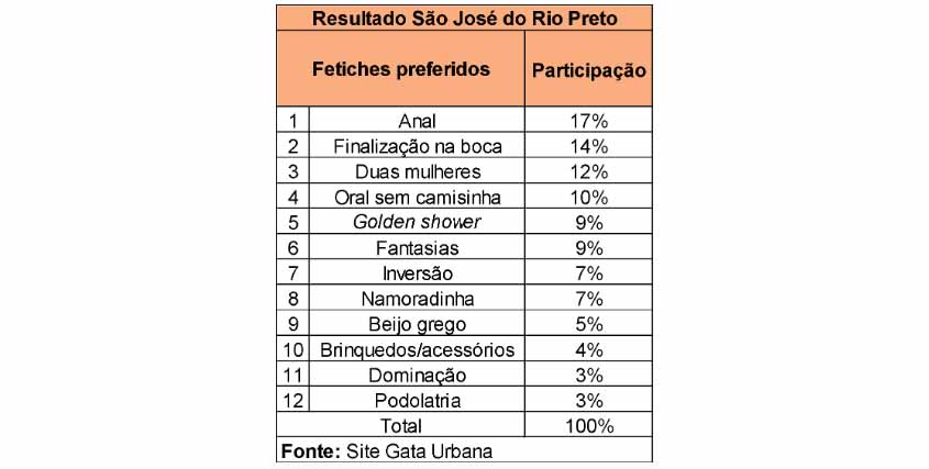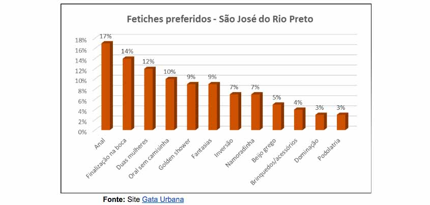 Os números fazem parte de um levantamento realizado na primeira quinzena de março, em nove cidades de São Paulo, Paraná, Santa Catarina e Rio Grande do Sul, que englobam um total de 2 mil mulheres cadastradas no site Gata Urbana. Em São José do Rio Preto, foram ouvidas 100 acompanhantes de luxo. O site enviou para essas garotas, via WhatsApp, a pergunta “qual o fetiche que os homens mais pedem para elas?” Para garantir consistência nas informações, a equipe também ligou para as acompanhantes para confirmar a resposta.